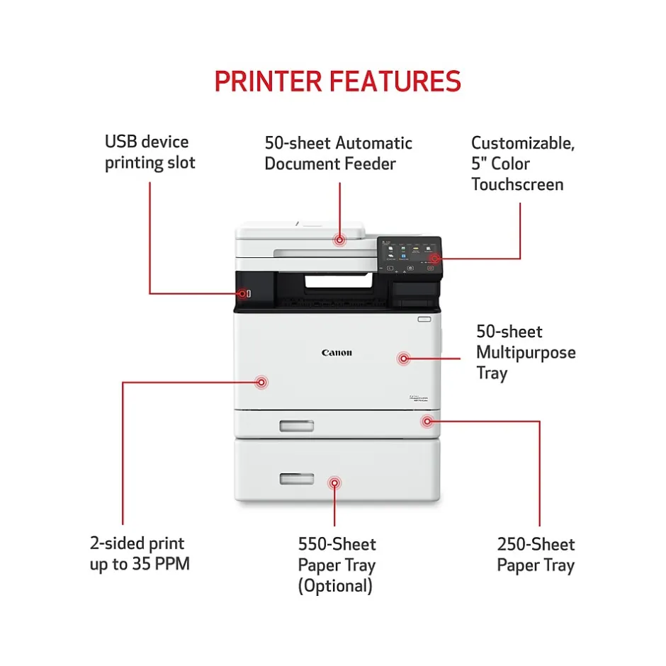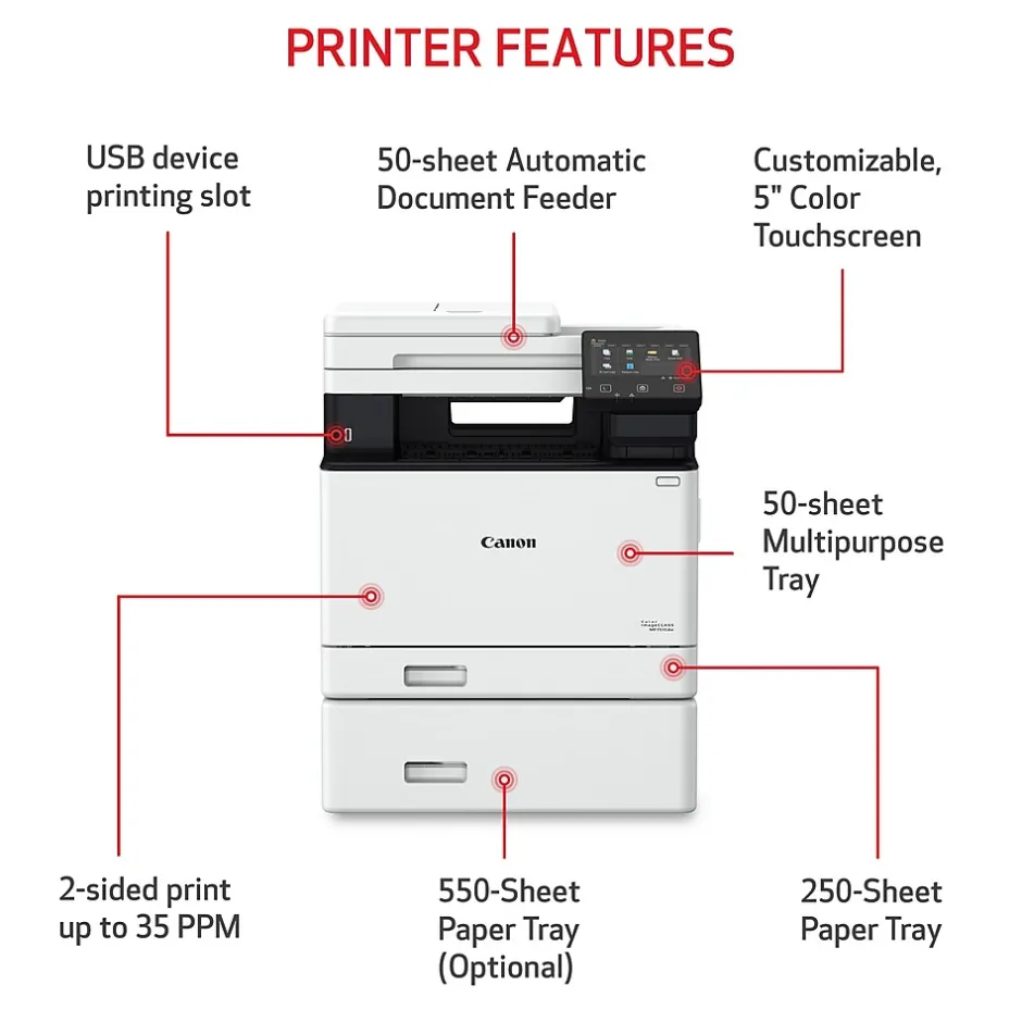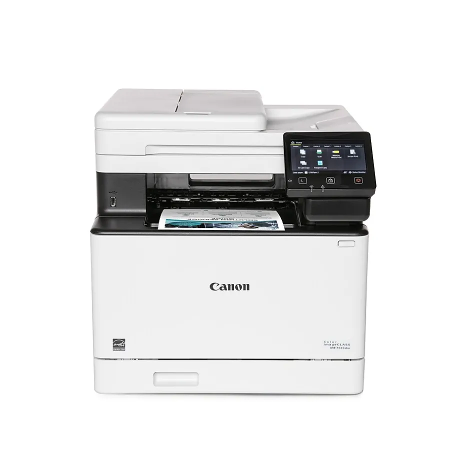 Canon Color imageCLASS’s diverse features and durability give you the confidence and flexibility to print everything from beautiful photos to impressive documents at home and in your small office. The MF751Cdw offers print, scan, and copy capabilities and can print up to 35 pages per minute. High-capacity toner option keeps up with your printing needs and limits toner replacement interruptions. Connect this printer to a wireless network in four simple steps. Print on the go with Canon PRINT Business, Apple AirPrint, and Mopria Print Service. Compatible with Windows, macOS, and ChromeOS. Standard paper capacity provides up to 250 sheets in the cassette and 50 sheets in the multipurpose tray. Optional cassette PF-K1 provides up to 550 sheets, giving up to 850 sheets of paper capacity (not included).
