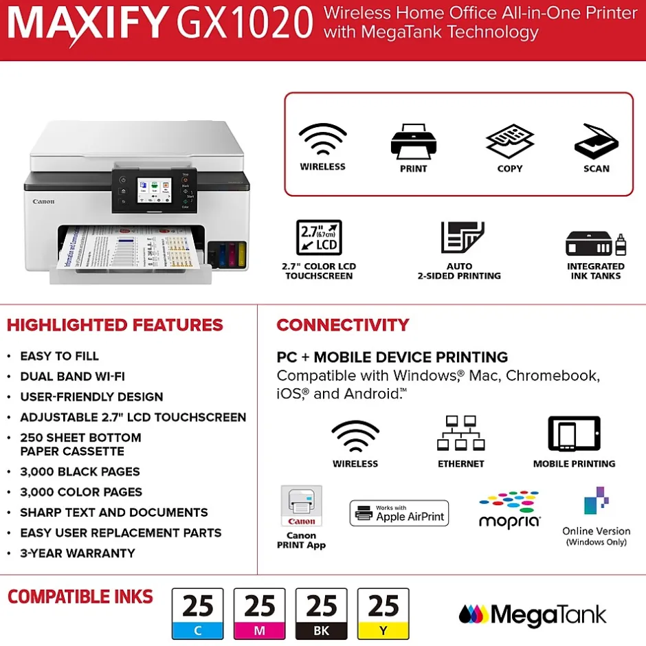 Canon MegaTank printers are a great choice for high-quality printing, value, and performance to help you get the job done. Great for hybrid working environments, the MAXIFY GX1020 has plenty of features to keep you productive from home or office, with office-like print quality. The MAXIFY GX1020 MegaTank all-in-one inkjet printer delivers high-quality, low-cost printing, and outstanding wireless connectivity in a compact size. Get serious print productivity with a high page yield of up to 3000 black and 3000 color pages with just a single set of inks. Plus, the GX1020 comes with a 3-year limited warranty or 60000 pages (whichever comes first) and is backed by Canon’s friendly and knowledgeable Service and Support network, so you can have peace of mind and focus on the business. The GX1020 is easy to set up and maintain and offers great media versatility to print on various media types and sizes, including photo paper, envelopes, banners, and more. Create beautiful and professional posters, banners, and signage with Poster Artist Online. Print both documents and photos on various paper types using a four-color pigment-based ink system for sharp black text and dye-based colors for vivid photos up to 8.5″ x 14″.