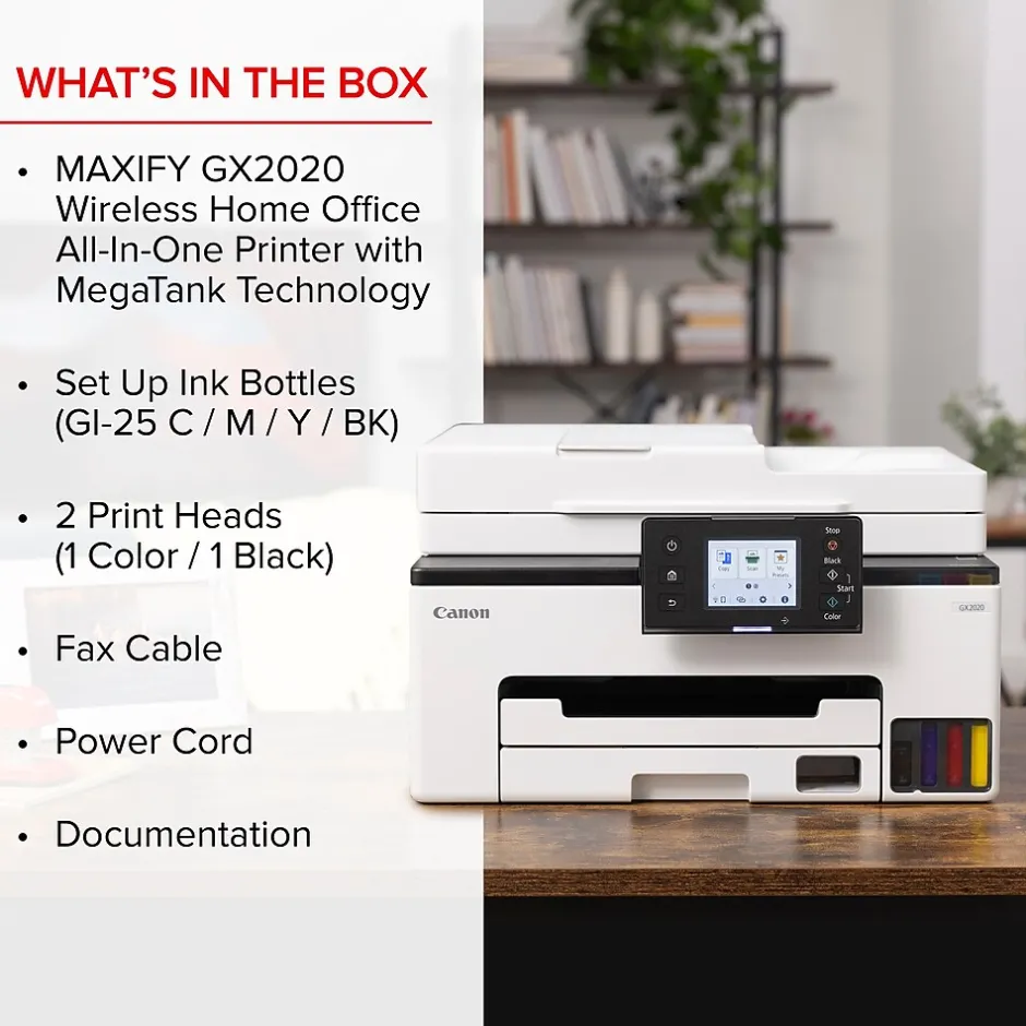 | Printer Use | Canon MAXIFY GX2020, setup ink bottles (GI-25 BK/C/M/Y), power cord, fax modular cable |