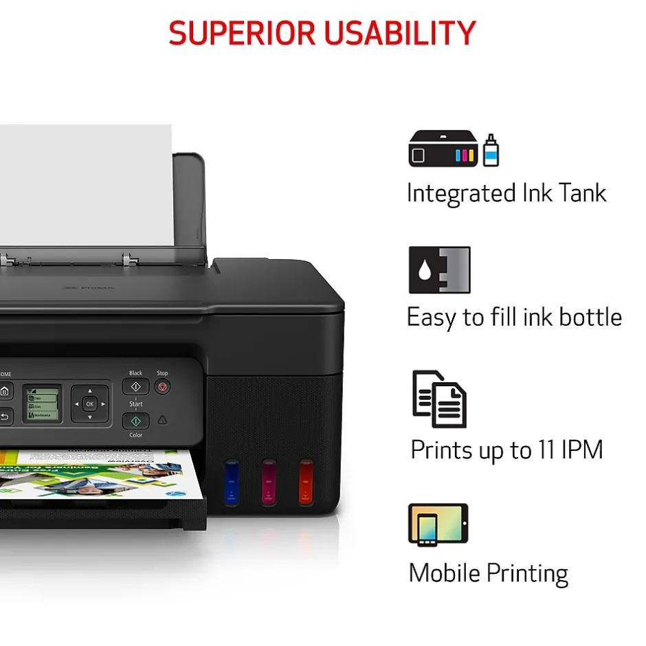 Experience exceptional performance and versatility with the Canon PIXMA G3270 MegaTank Wireless Color All-in-One Printer. Perfect for home and home office use, this borderless inkjet printer offers remarkable wireless connectivity and an impressive print resolution of 4800 DPI. The hybrid ink system ensures sharp black text and vibrant colors on various media types, including envelopes, high-resolution paper, recycled paper, and semigloss photo paper. Create stunning borderless photos up to 8.5″ x 11″ and enjoy a convenient paper capacity of up to 100 plain sheets or 20 photo sheets (4″ x 6″). Rapid print speeds combined with four-color pigment-based ink system provide crisp and eye-catching documents. Stay connected with hi-speed USB and print effortlessly from computers or mobile devices for a seamless printing experience. Upgrade your productivity with the Canon PIXMA G3270 MegaTank wireless Color All-in-One Printer today.