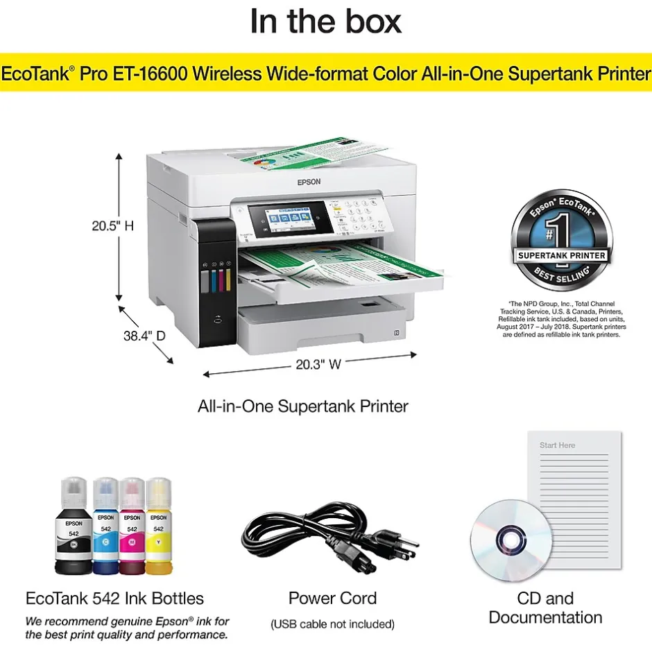 | Family Model # | EcoTank Pro ET-16600, power cord, 1 bottle of 542 Black ink (127 mL) and 1 bottle each of 542 Cyan, Magenta, Yellow (70 mL), CD-ROM for product setup |