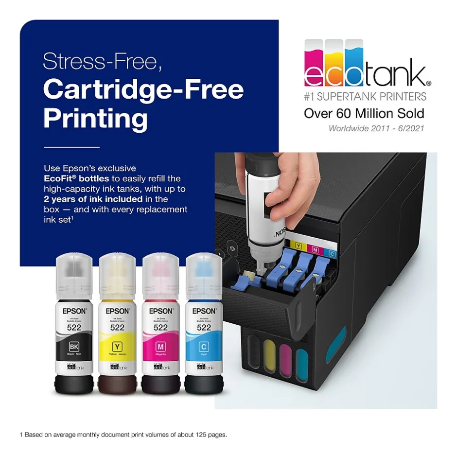 - Fewer out-of-ink frustrations — each set of replacement bottles includes enough ink to print up to 7,500 pages black/6,000 color