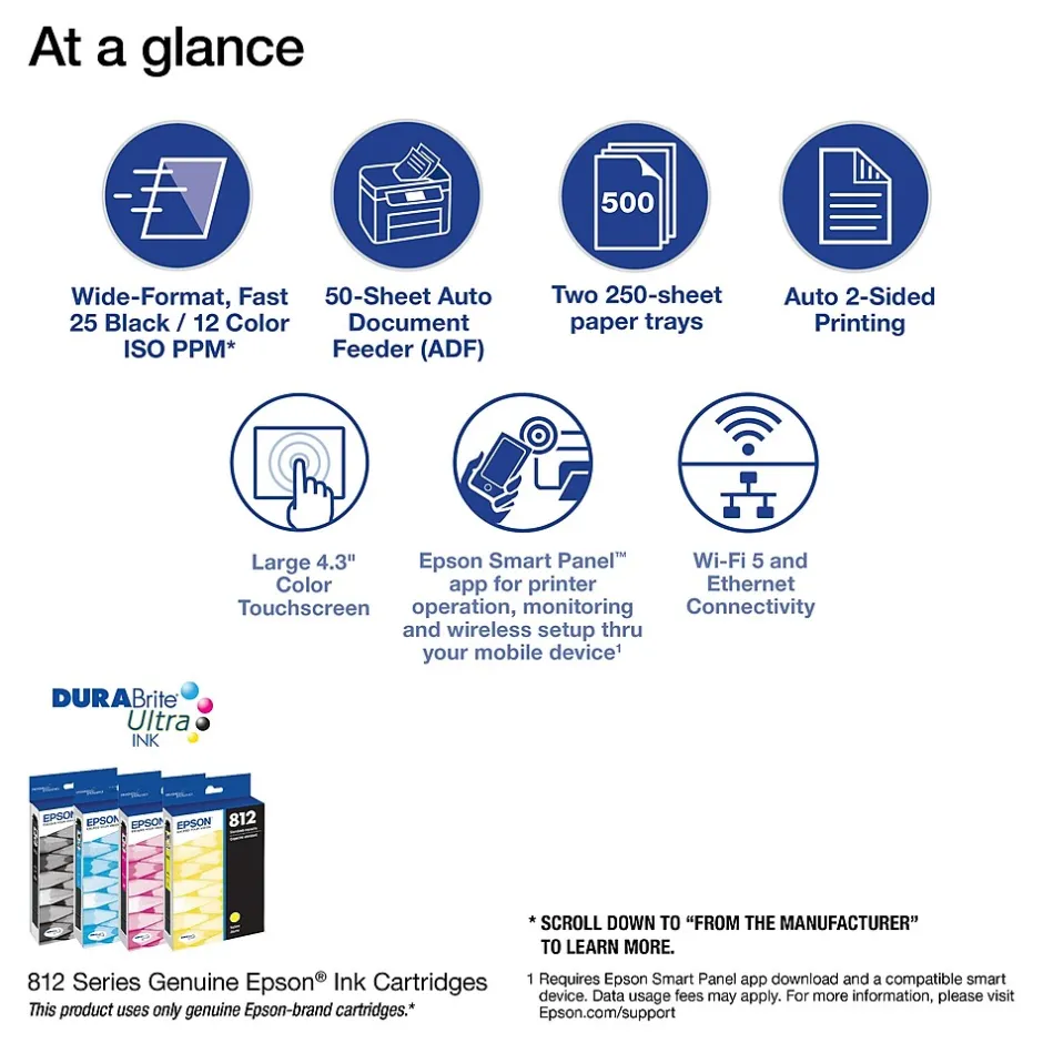 - Easy to use — 4.3″ color touchscreen for quick navigation and control, plus all-new Epson Smart Panel App for enhanced connectivity and productivity from your mobile device