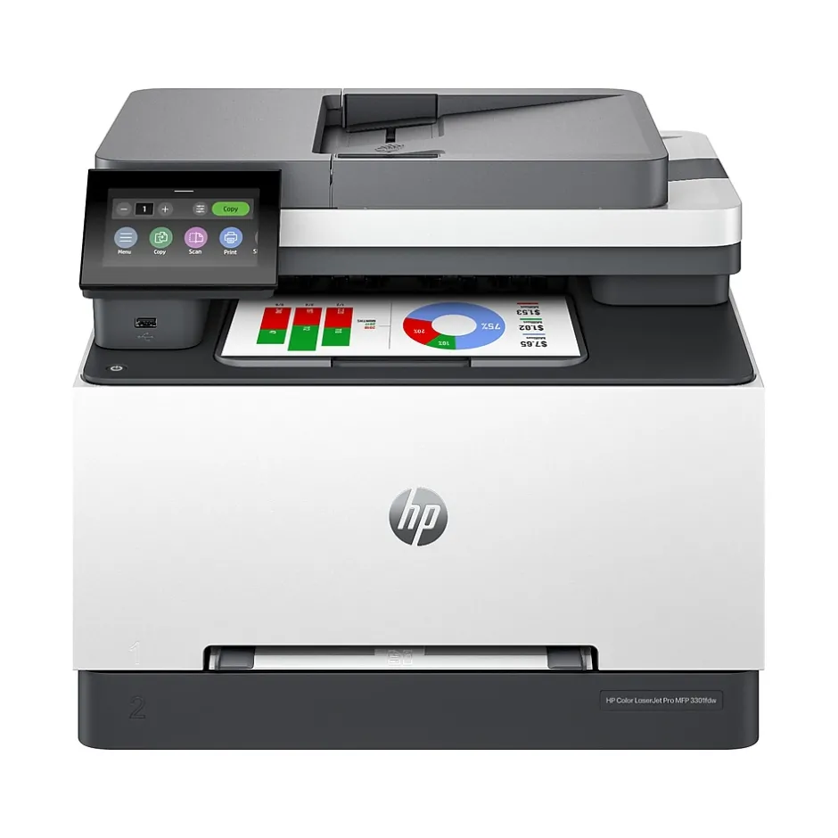 Ideal for offices, get vibrant laser-quality color and powerful productivity with the Color LaserJet Pro MFP 3301fdw. This all-in-one color laser printer is loaded with features and incredible speed perfect for offices. Print, scan and copy from anywhere with HP app. Connect via wireless or ethernet with the 3301fdw, an mfp that has built-in Wi-FiĀ® and HP Wolf Pro to keep your information secure.