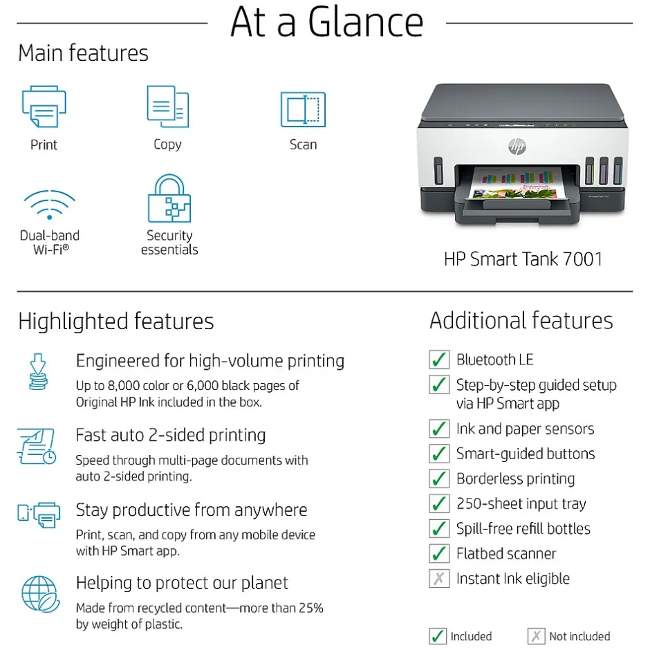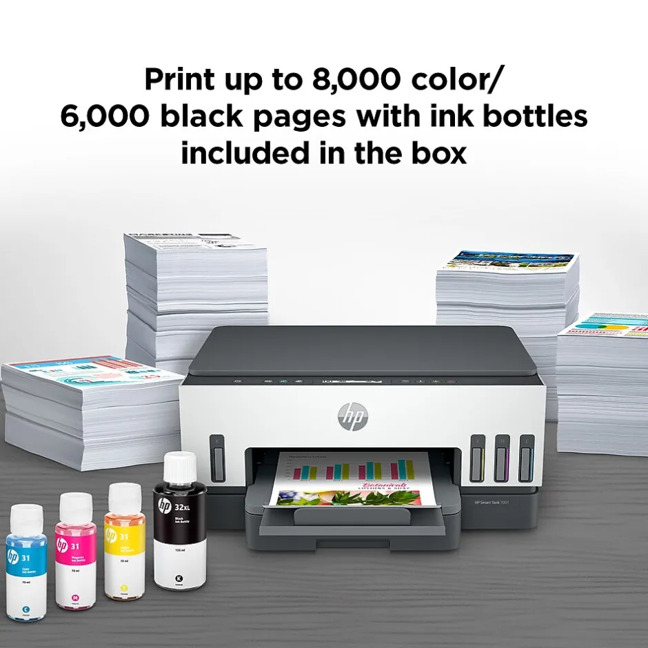 The HP Smart Tank 7001 Printer is a smart, connected and refillable tank printer that makes printing seamless for your home with its high capacity and wireless connectivity. Create everyday color documents at a low cost with 2 years of Original HP Ink included in the box. This Smart Tank printer is an inkjet perfect for high-volume printing.