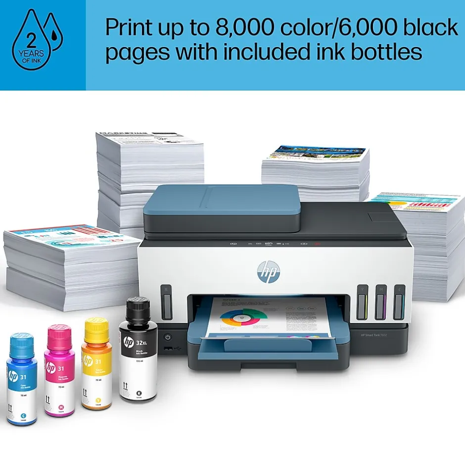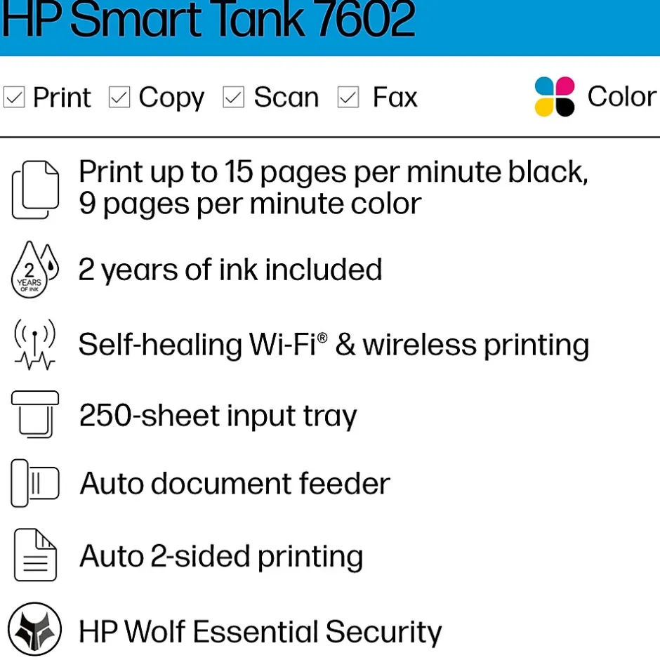 The HP Smart Tank 7602 Ink Tank Printer is a smart, connected and refillable tank printer that makes printing seamless for your home and small business with its high capacity, wireless connectivity and Ethernet networking. Create everyday color documents at a low cost with 2 years of Original HP Ink included in the box. This printer is an all-in-one inkjet perfect for high-volume color printing, scanning, copying and fax.