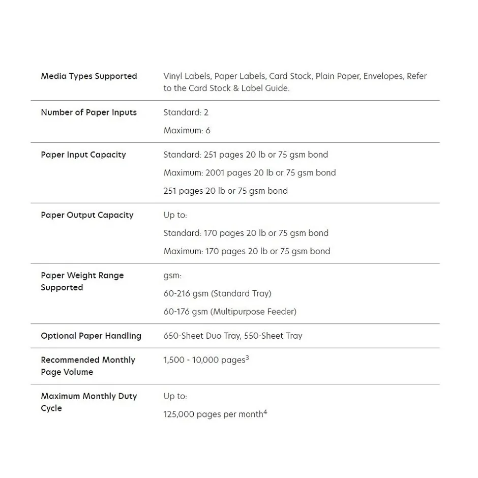 - Media Handling: 250-sheet input tray, 1-sheet manual tray
