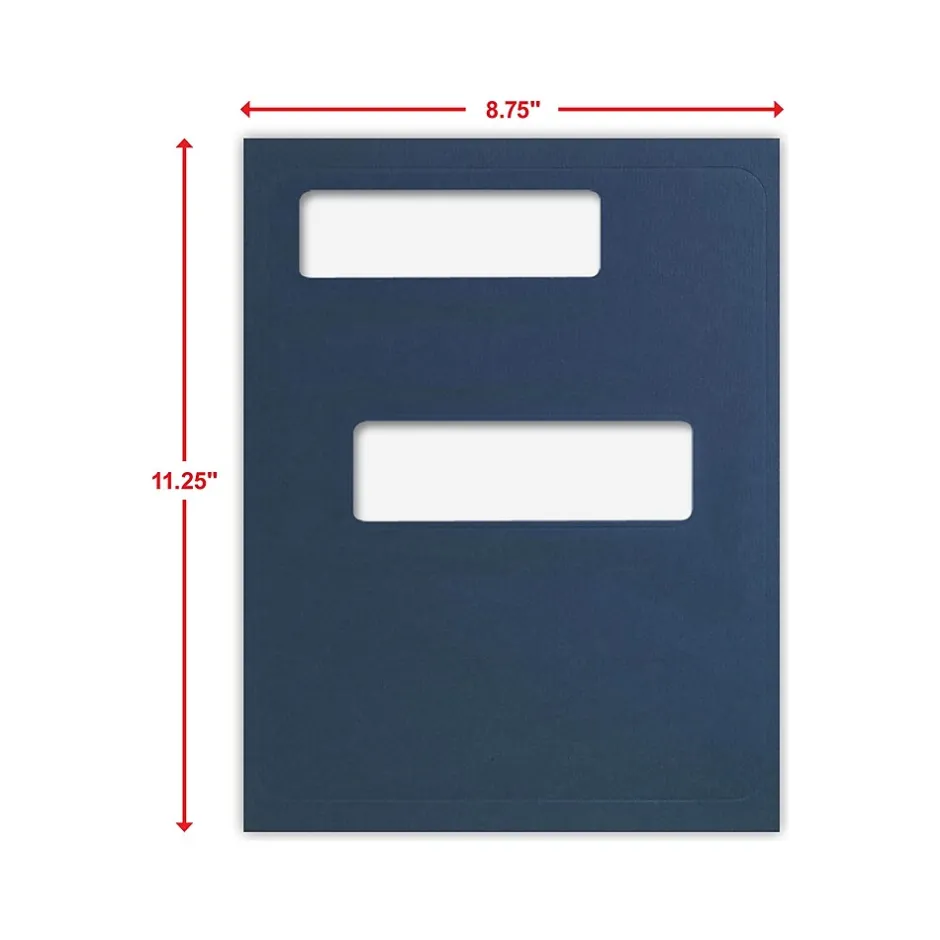 - Double-window presentation folder in navy blue; 50 folders per pack