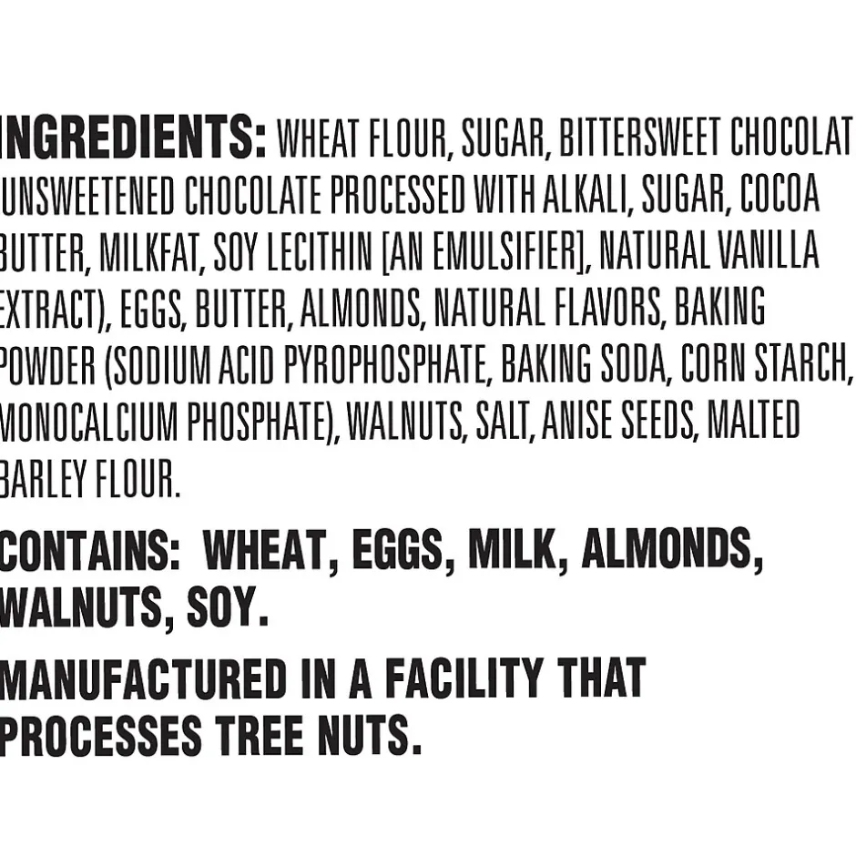 - Light, crunchy cookie filled with almonds and walnuts dipped in gourmet bittersweet chocolate