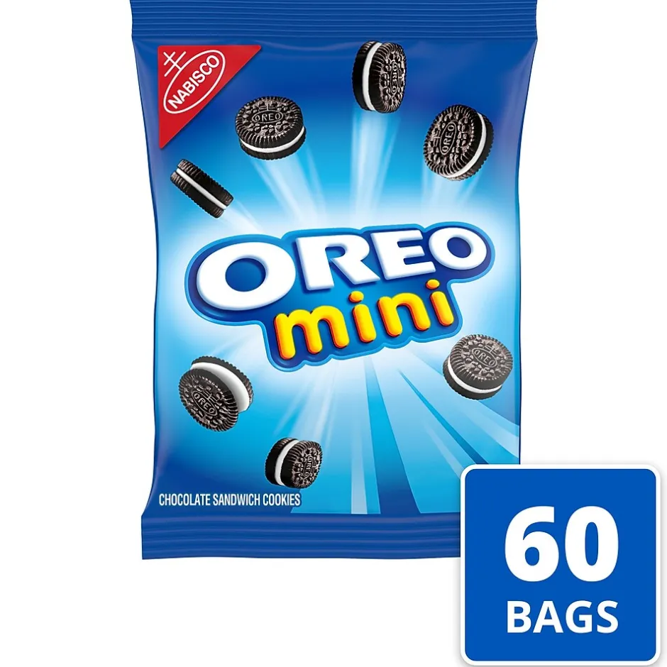 Oreo Mini Oreo cookies are delicious and healthy. Cookies are sold in 1.5 oz bag with 60 bags per box.
