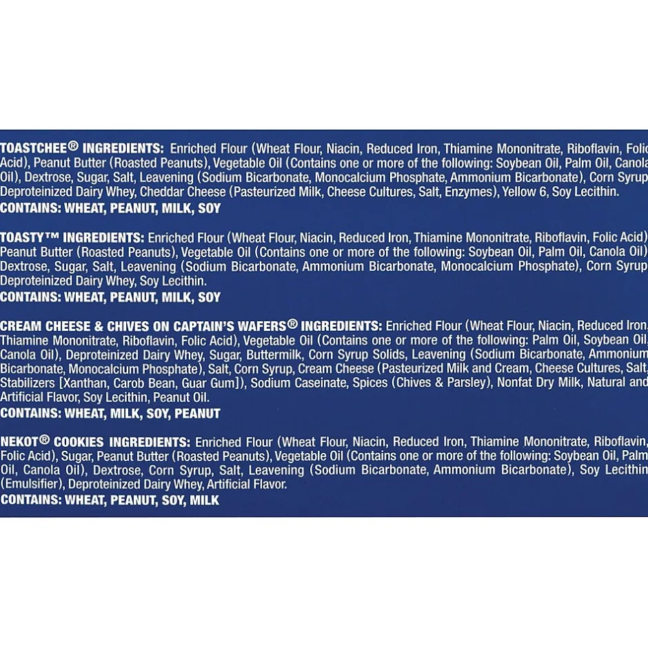 Grab a package of these Lance Crackers and enjoy the great flavors of these sandwich crackers. With 36 packs of delicious crackers in flavors like Nekot Peanut Butter Crackers, Cream Cheese with Chives on Captain’s Wafers, Peanut Butter on Toasty, and Peanut Butter on Toastchee, this variety pack is perfect for the home or office. Add some flavor to your lunches, or the break room vending machine with this Lance Crackers Variety Pack.