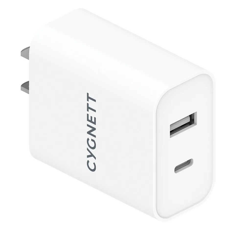 Charge multiple devices at once with the Cygnett PowerPlus 38-Watt Dual Port Wall Charger! This 38-watt dual USB wall charger features 20 watts of USB-C Power Delivery, plus 18-watts USB-A. It can fast charge any Samsung, iPhone, iPad, or Google Phone, and can charge 2 devices at once!