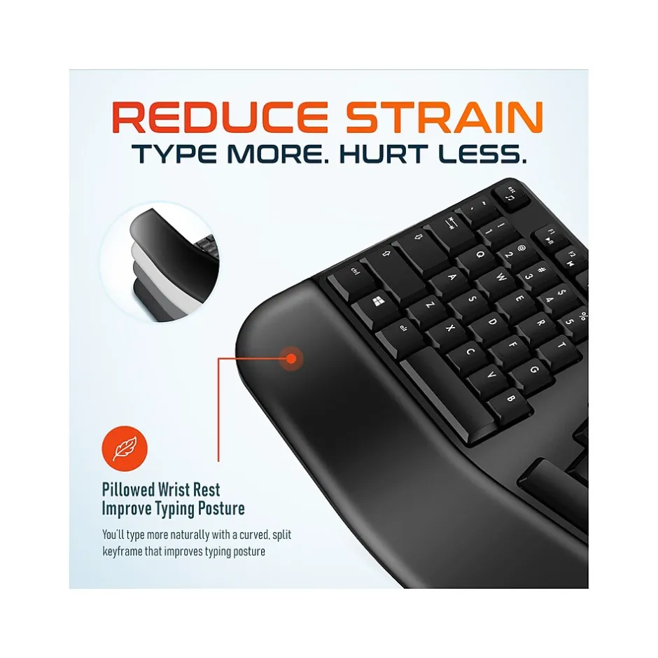 - Wireless keyboard has a split key ergonomic design to encourage a healthier wrist posture that reduces hand fatigue and wrist strain