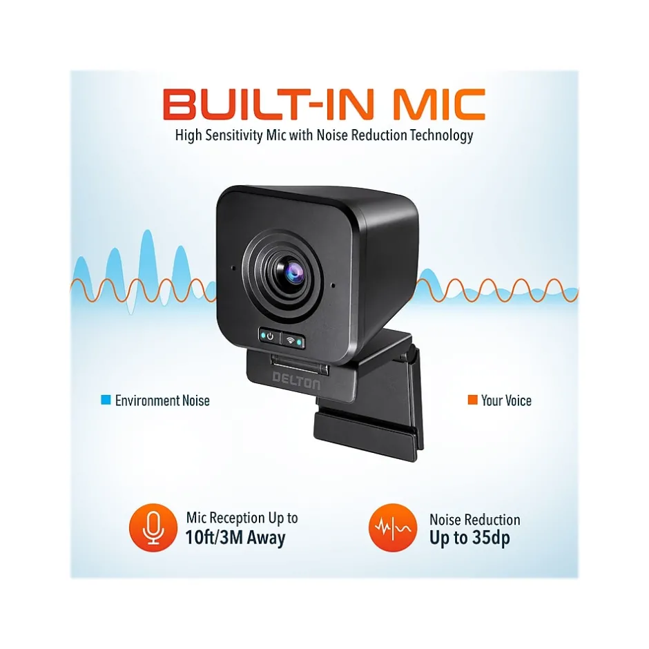 Go beyond what a simple 1080p webcam with microphone can deliver, and confidently move through your presentations or meetings with the Delton wireless HD 1080p video camera. The built-in digital microphones make sure that your audience hears you clearly, while a completely wireless interface means you’re free to showcase the best angles in every presentation. Setup is super simple: just plug the 2.4G USB dongle into your PC/laptop’s USB port, and you’re ready to go. Built-in image technology will automatically make adjustments to color and contrast to get the highest-quality image. Place the computer camera on a monitor using the built-in mount, attach to a tripod (not included) using the tripod thread, or position the webcam at an optimal angle on any surface without worrying about cable reach or tangle. No matter where it stands, the camera will deliver a crystal clear high-definition 1080p image and can comfortably be taken with you mid-stream so that you can showcase your best work.