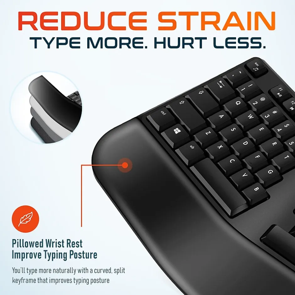 - Rheumatologist recommended ergonomic keyboard and mouse with a split frame key layout and vertical grip design proven to reduce wrist strain