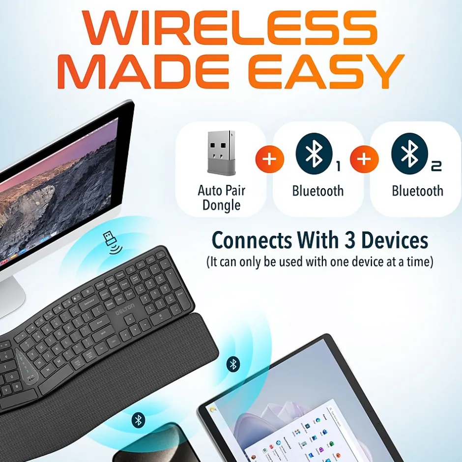 Elevate your workstation with Delton KB250 Bluetooth wireless keyboard, designed to enhance comfort and productivity. This Mac wireless keyboard boasts a full size with a numpad. Say goodbye to constantly replacing batteries with its built-in rechargeable battery, providing wireless convenience. This silent wireless keyboard offers 2.4GHz wireless and Bluetooth compatibility, allowing easy connection to your devices, including Windows, Mac, PCs, and laptops. Experience a peaceful work environment with its quiet and curved keys, allowing undisturbed typing. The silent ergonomic keyboard features a curved design that aligns with the natural shape of your hands, promoting a more comfortable typing posture. It also comes with a wrist pad to support your wrists during long periods of typing, reducing strain and discomfort. Simply plug the USB wireless keyboard into your device via a USB dongle or Bluetooth connection for instant use, no need for complicated setup or installation.