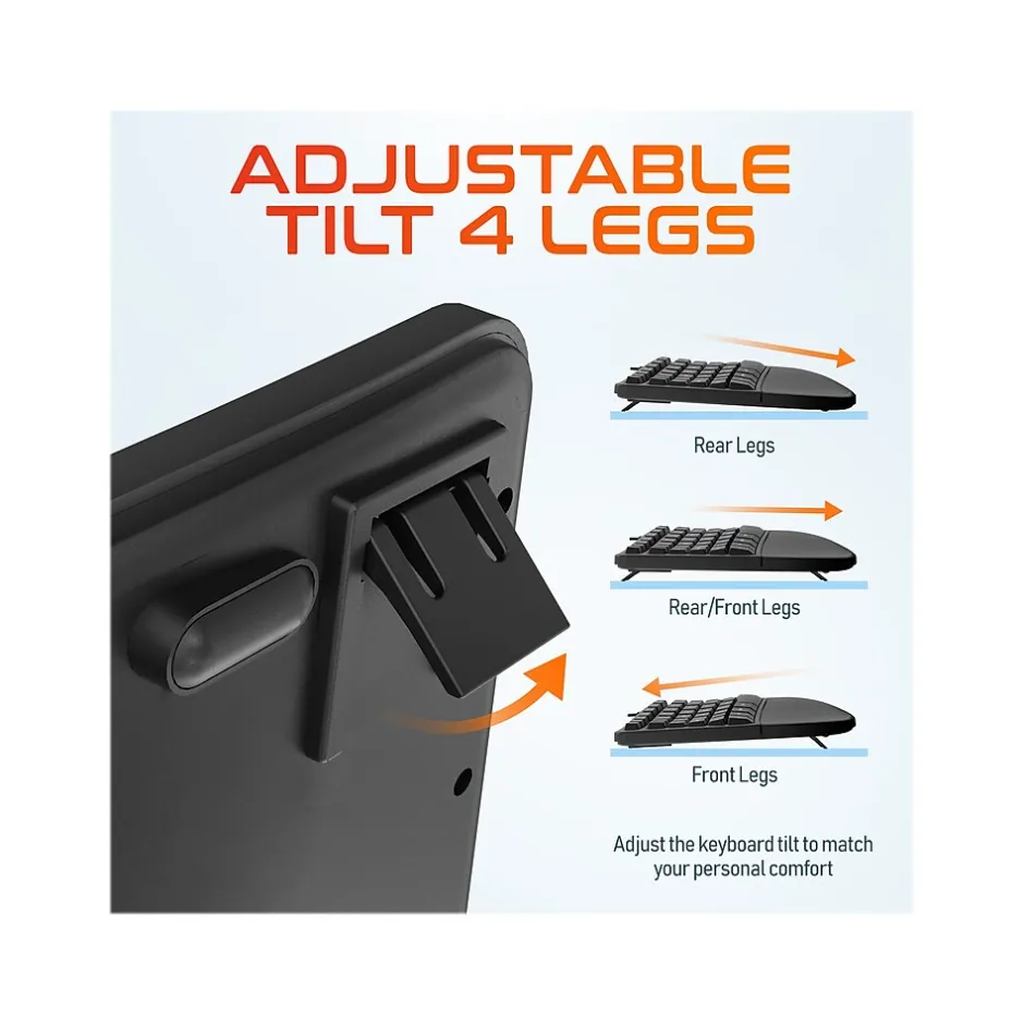 - Keyboard features a pillowed wrist rest and adjustable tilt legs for a customizable typing angle, full number pad, 12 F-keys, and media controls (quiet keys are smooth to the touch and curved for a comfortable typing experience)