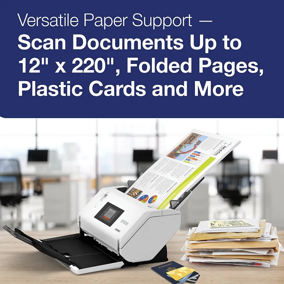 Designed for busy offices, the DS-30000 large-format document scanner makes it easy to take on any project. It features speeds up to 70 ppm and includes a host of productivity features, such as a 120-sheet Auto Document Feeder, dual-sided scanning and a 2.7″ programmable touchscreen. With versatile paper support, it can scan documents up to 12″ x 17″, as well as folded pages, plastic cards, sealed envelopes, passports and more. It also includes TWAIN and ISIS drivers for compatibility with existing software. Designed for the desktop, the DS-30000 easily fits your workspace. Plus, it delivers a 30,000-page peak daily duty cycle and is backed by a 3-year limited warranty.