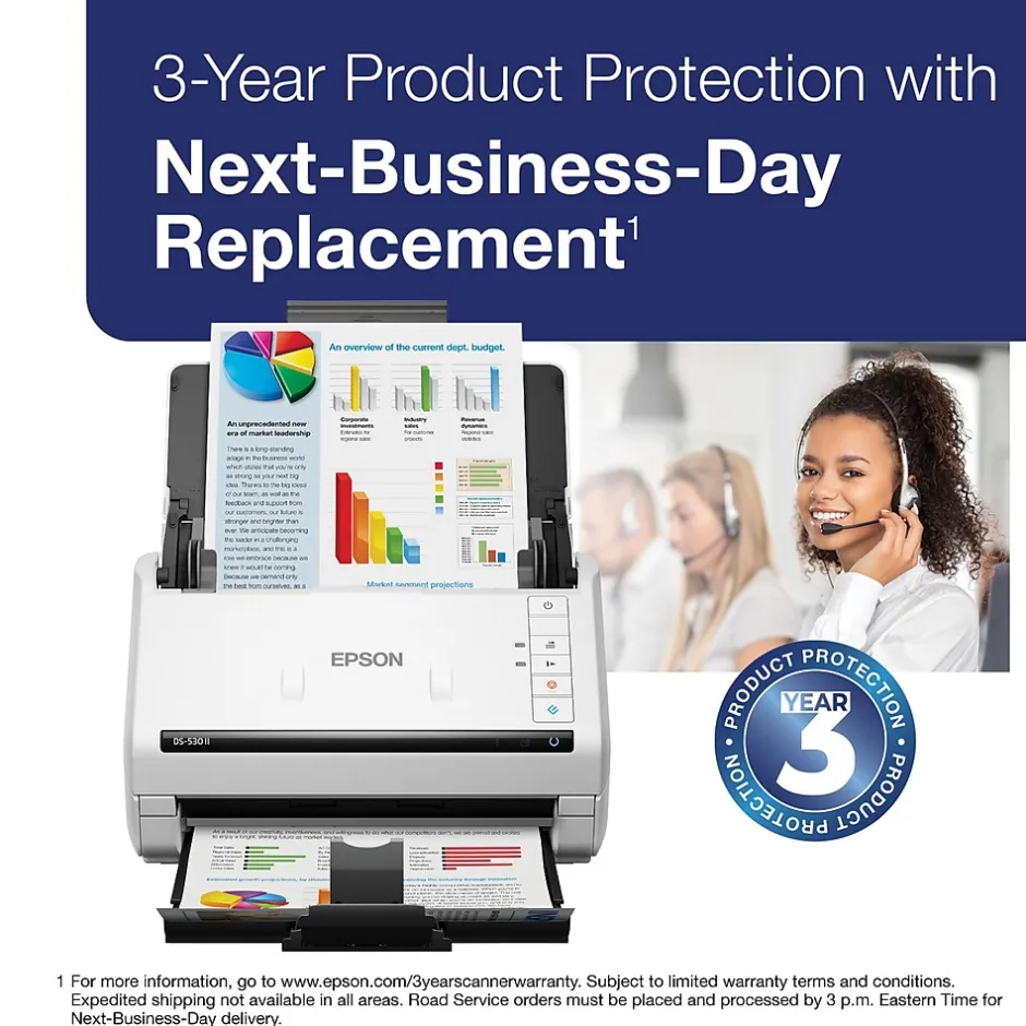 The DS-530 II color duplex document scanner is the smart choice for business document management, offering fast, efficient performance. Featuring speeds up to 35 ppm/70 ipm, this powerful, compact performer offers a peak daily duty cycle of up to 5,500 sheets and includes TWAIN and ISIS drivers for seamless integration with most existing document management systems. Advanced paper feed technologies such as blank page removal, auto rotation, auto cropping, Dirt Detection and Paper Protection help enhance productivity, while a 50-page Auto Document Feeder saves time. And it comes with an industry-leading 3-year limited warranty with Next-Business-Day Whole Unit Exchange.