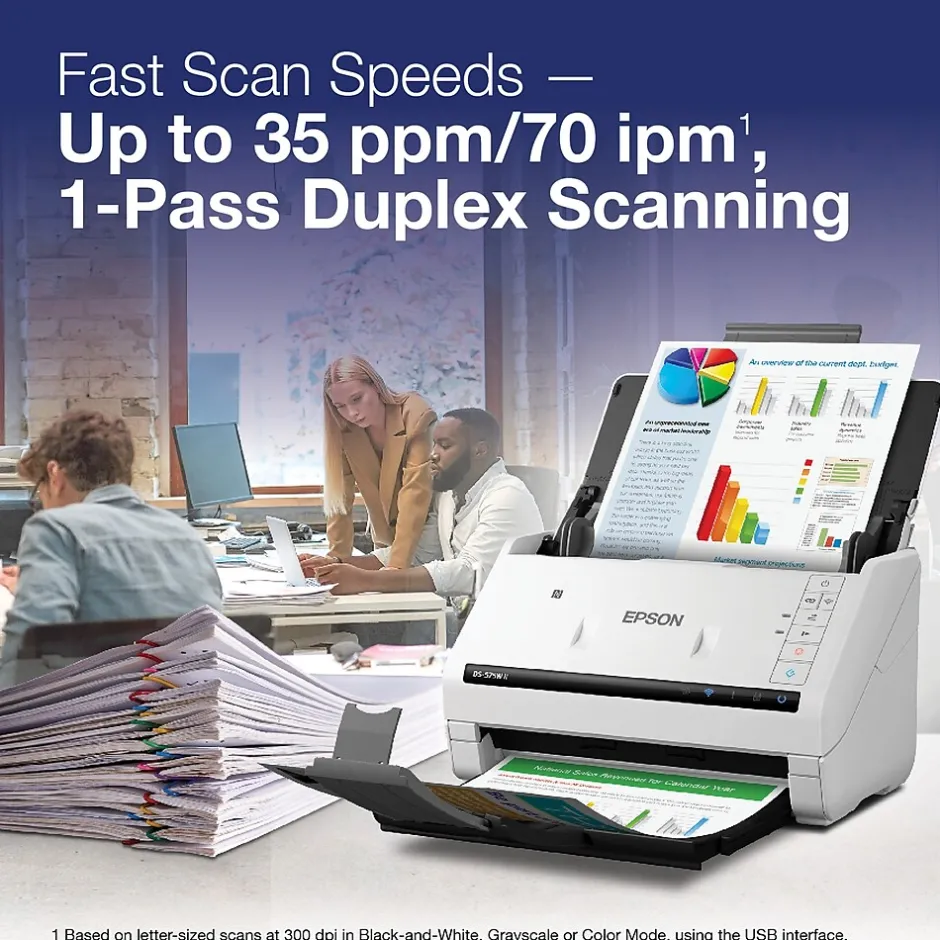 Delivering high-quality scans at up to 35 ppm/70 ipm, the DS-575W II color scanner offers efficient document management for busy businesses. Get easy wireless setup with the Epson Smart Panel app. Wirelessly scan to smartphones, tablets or online storage accounts. Quickly scan stacks of pages via the 50-sheet ADF. Included TWAIN and ISIS drivers ensure easy integration with most existing software, while a peak daily duty cycle of up to 5,500 sheets helps enhance productivity. And it’s all backed by an industry-leading 3-year limited warranty with Next-Business-Day Whole Unit Exchange.