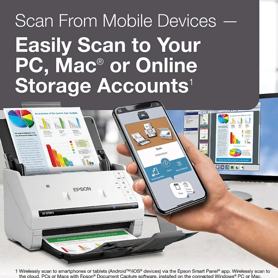 - Scan from smartphones and tablets — Epson Smart Panel app makes it simple to operate your scanner from your mobile device; scan wirelessly to your PC or Mac, or online storage account