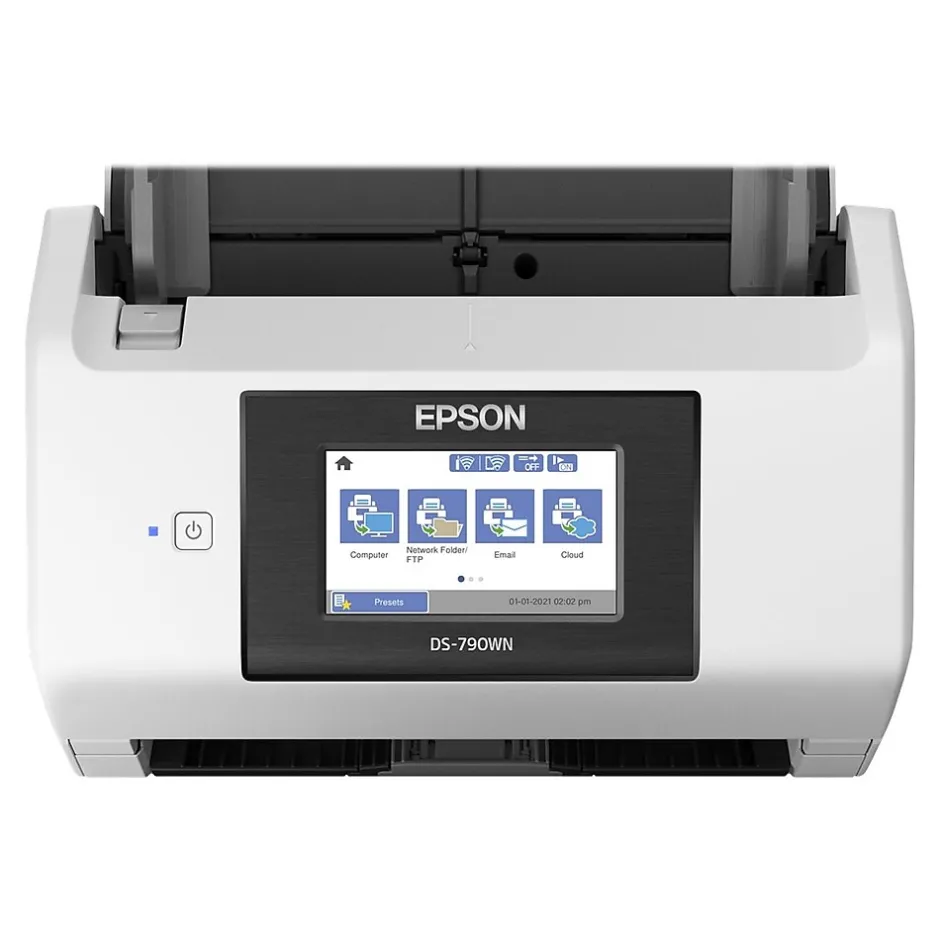 Fast, versatile and powerful, the DS-790WN combines network connectivity, enhanced security features and PC-free scanning so you can manage your business solutions with confidence. Designed for reliability plus ease of use, the DS-790WN delivers high-quality scans up to 45 ppm/90 ipm with a peak daily duty cycle up to 7,000 sheets, one-pass duplex scanning and a high-volume 100-page ADF that accommodates business and ID cards as well as extra-long pages up to 240 inches. The intuitive 4.3-inch color LCD touchscreen allows you to access multiple jobs and email or scan to a USB drive, your network or cloud storage services without the need for a computer. Gain full control of your documents with individual user authentication via the touchscreen or an optional card reader, including customizable scan settings and access to personal usage records. The DS-790WN enables efficient document management and integration to optimize your business – it includes both TWAIN and ISIS drivers for seamless integration with most existing enterprise software. With included OCR software, you can generate searchable PDF files as well as editable Office documents. Built-in LAN and Wi-Fi network connectivity allows for easy scanning, and you can scan with your mobile device using the Epson Smart Panel app on iOS or Android.