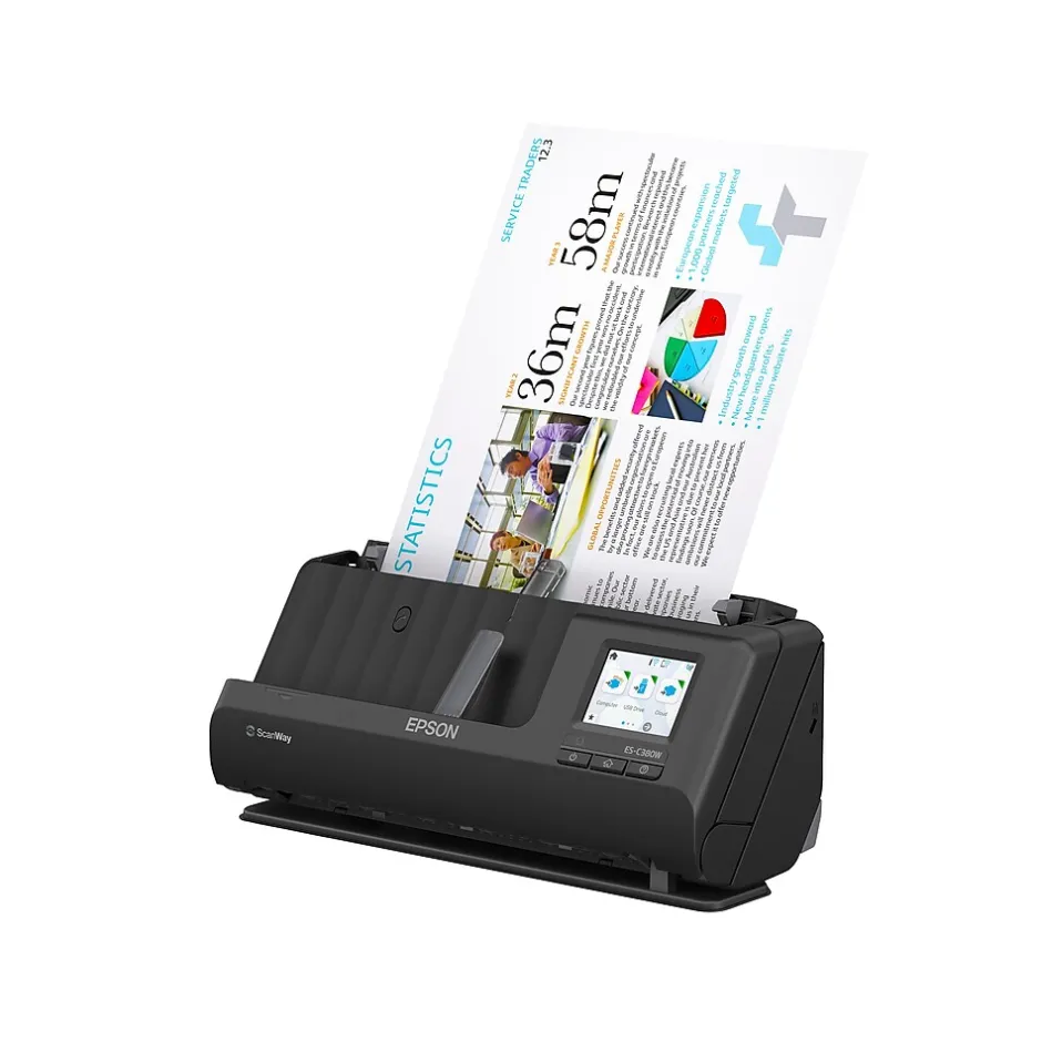 A modern wonder, the powerful Epson WorkForce ES-C380W keeps things simple with its intuitive design and exceptional flexibility. With the ES-C380W, you can organize stacks of documents and make keeping piles of paperwork for your records a thing of the past. Designed for fast and easy document management, this high-performance workhorse offers the features you need to keep business moving, such as two-sided scanning and wireless connectivity. The remarkably compact and lightweight ES-C380W saves 60% of desk space, meaning you can put it virtually anywhere in your home or office so you can stay productive, even when space is limited. The scanner offers a robust solution to managing your workflow: with the included Epson ScanSmart software, you can preview, email, and upload your scans to cloud storage services. In addition, ScanWay standalone scanning enables you to scan to a USB drive, your mobile device, or the cloud using the scanner’s bright 2.4″ LCD touch screen, no computer needed. A 20-page auto document feeder allows you to scan batches of documents efficiently, while intelligent image adjustments such as automatic cropping and paper skew correction help ensure that you enjoy amazing image quality with each scan. With the ES-C380W, take productivity and versatility to the next level, creating a neat and efficient workspace for peace of mind.