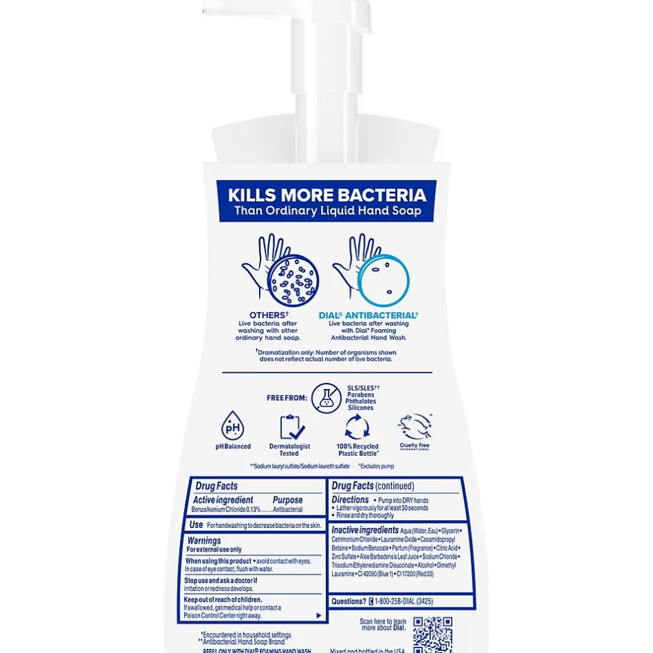 Enjoy the fresh scent of the Dial Antibacterial Defense Coconut Water foaming hand wash. The formula contains aloe vera and kills more than 99.99% of bacteria while being gentle on skin, leaving it feeling soft, smooth, and healthy. Dermatologist-tested and approved as cruelty-free under the Leaping Bunny program.