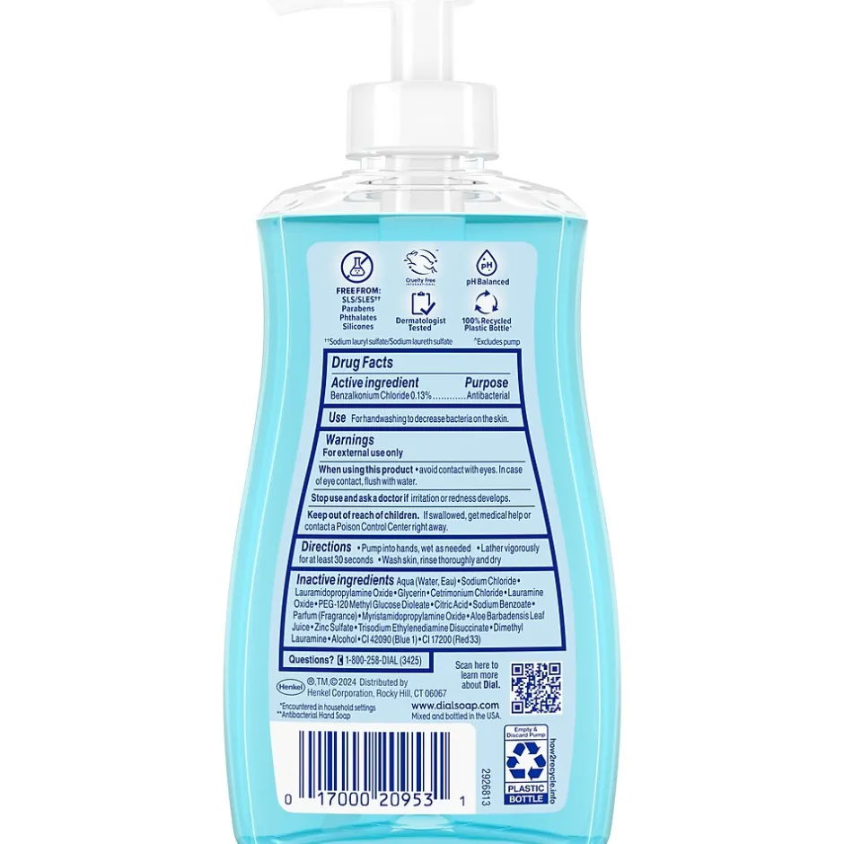 Feel the sensation of an invigorating clean with the Dial Complete Spring Water antibacterial liquid hand soap. Find refreshment in a hand wash that removes dirt and bacteria while conditioning skin. Now you can get tough on dirt and bacteria while being gentle on your hands. This Dial antibacterial hand soap kills 99.99% of bacteria, plus it’s mild enough for frequent use. Dial is one of the doctor-recommended hand soap brands. Awaken your senses as you wash, with the natural and refreshing Spring Water scent that’ll leave you with healthy-feeling skin. How to use: pump into hands, lather vigorously in hands for at least 30 seconds, then rinse clean with water, and enjoy soft, healthy-feeling hands.