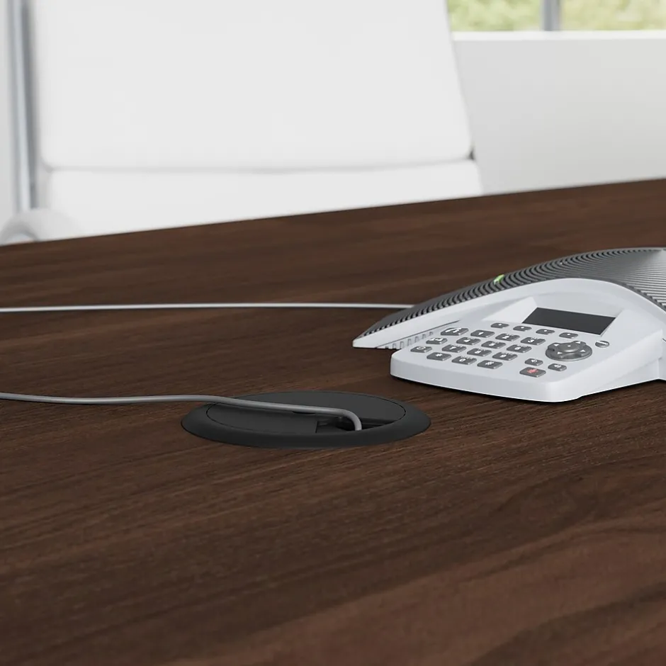 - Modern conference table includes two wire management grommets for convenient use of laptops, projectors and other equipment