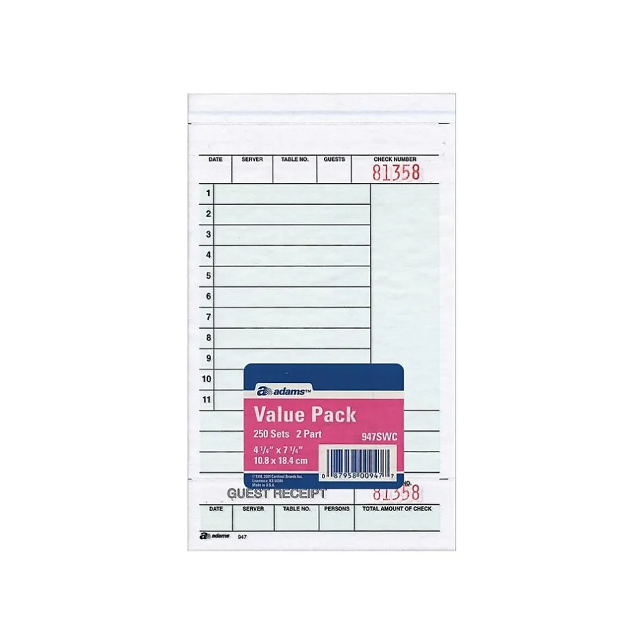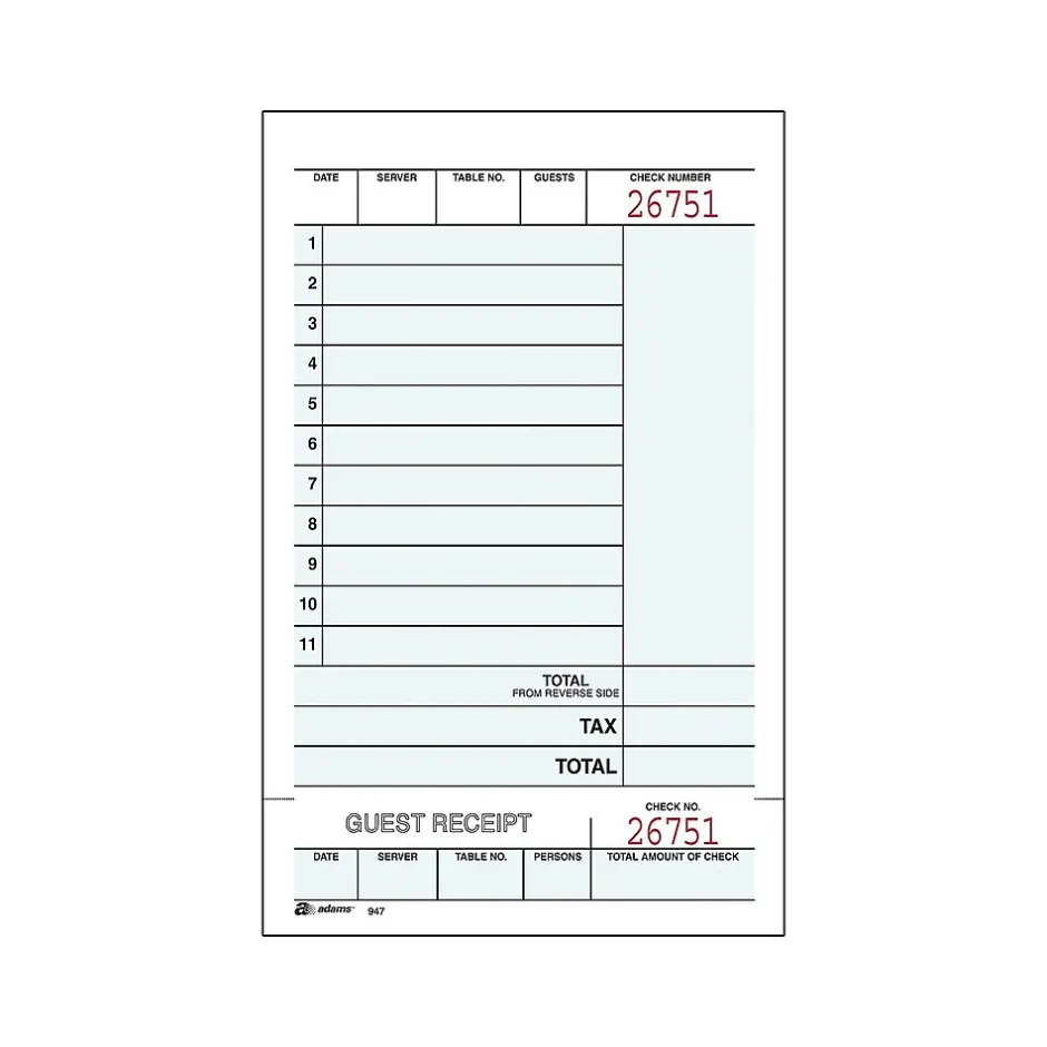 Take orders with these guest checks. Consecutive numbering on the top and on the stub makes staying organized simple, while the back of part two is ideal for jotting down beverage requests. These Adams guest checks come with 250 sets per package and feature two parts; the second part comes with a perforated edge, making it easy to remove and hand to customers.