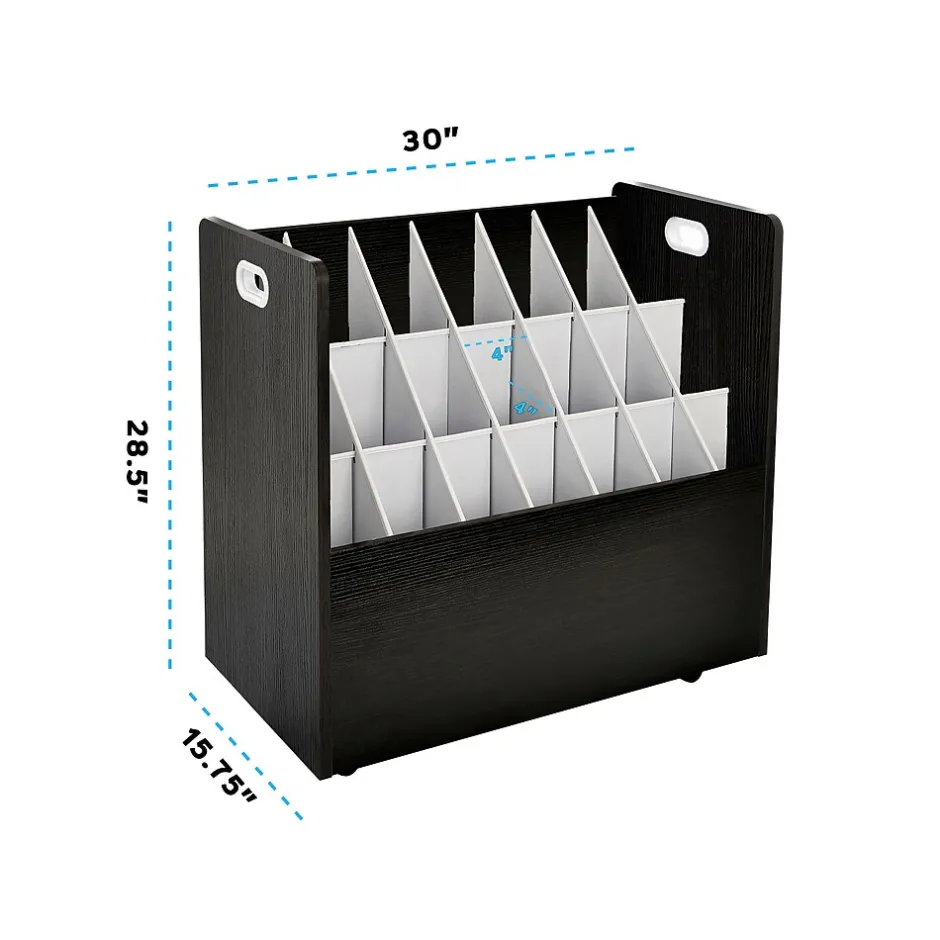 - Holds rolled files comfortably in square 3.75″ compartments