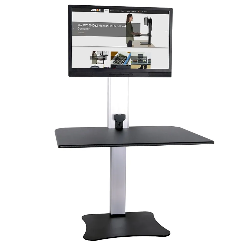 The Victor DC400 transforms any sit-down desk into a sitting OR standing desk. The 28” wide by 23” deep surface is raised up to 20” for ergonomic placement of monitor, keyboard, mouse, telephone and papers while standing.Electric motor design allows easy custom height adjustment with the push of a button. The monitor holder is also height-adjustable with a range of 12.5”.Easy Tap Technology makes operation quick and simple. Safety Sensor stops movement when obstacles are detected under the desk.