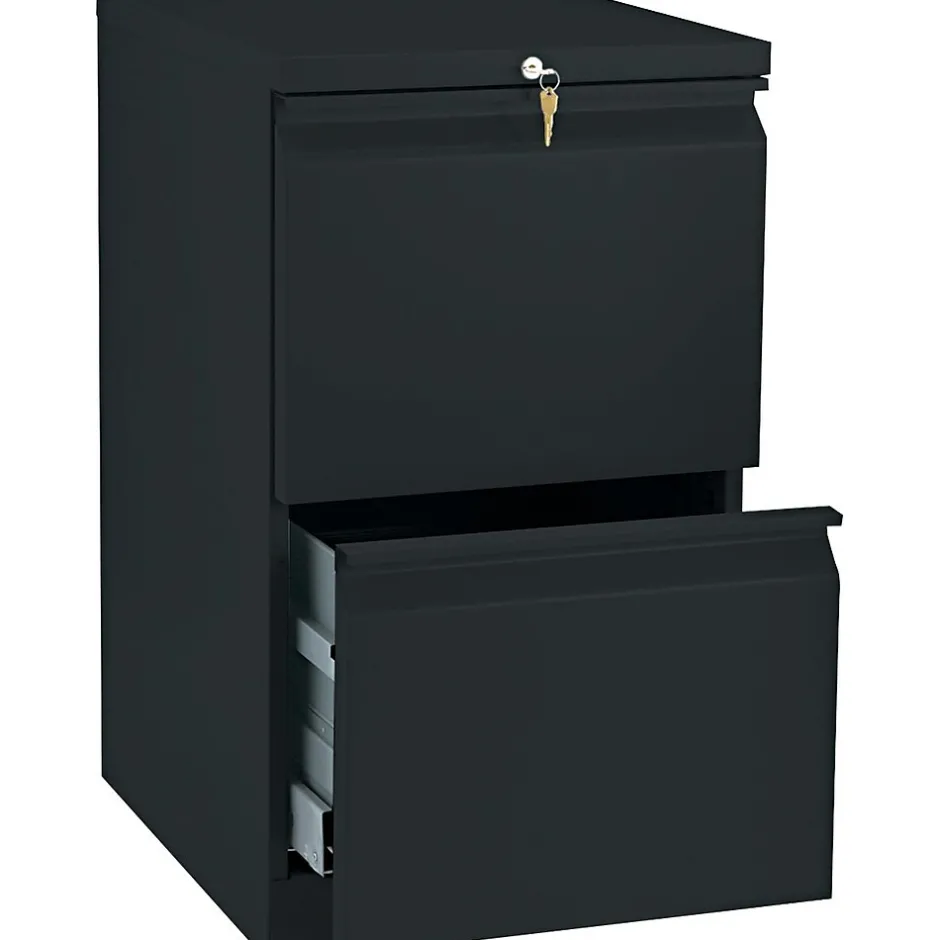 HONĀ® Brigade⢠2 Drawer mobile pedestal file in black color measures 28″ x 15″ x 19 7/8″ and ideal for letter-size files. Pedestal file features counterweight anti-tip mechanism with steel ball bearing suspension for easy sliding.