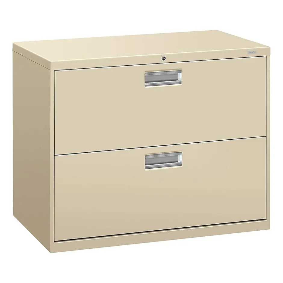 Keep your work space organized with this two-drawer lateral filing cabinet. It has a counterweight and mechanical interlock that keeps only one drawer open at a time for added stability, and leveling glides allow for proper placement on uneven floors. With a two-sided lock mechanism and removable lock core, this HON Brigade 600 series lateral file keeps sensitive documents securely tucked away.
