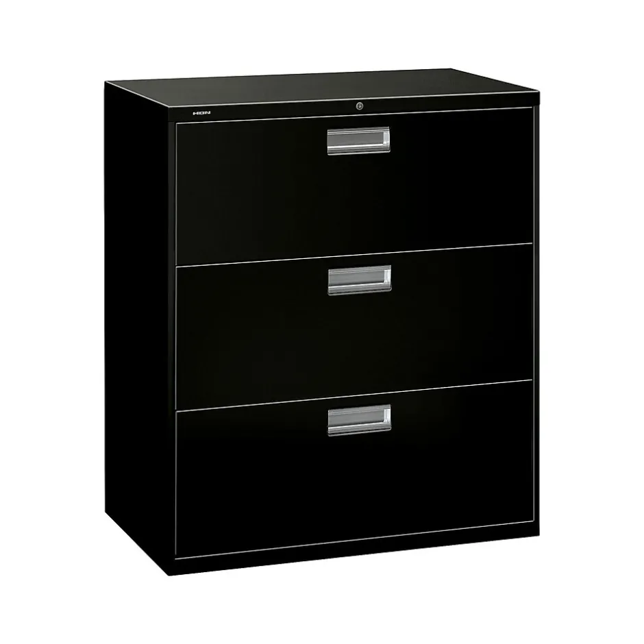 - Three-drawer lateral filing cabinet holds letter- or legal-size documents