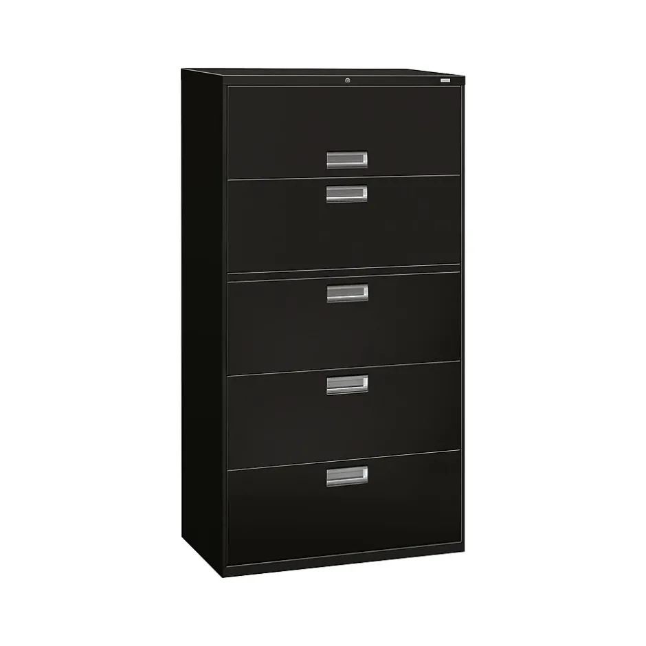 Organize important files and documents with this five-drawer lateral file cabinet. The integrated two-sided locking mechanism prevents unauthorized entry, and the built-in counterweight prevents the cabinet from tipping forward when the drawers are fully extended. This HON Brigade 600 lateral file has heavy-duty steel ball bearings that makes the drawers easy to open and close, and the all-welded case helps the cabinet stand up to commercial environments.