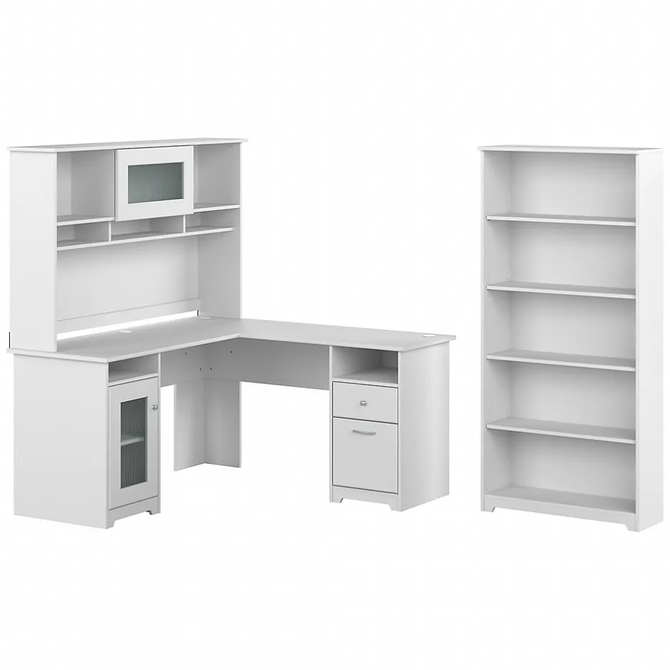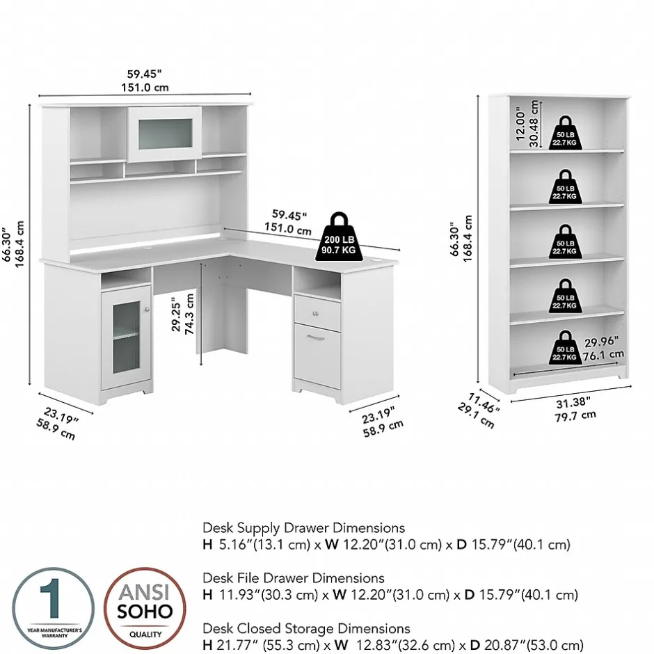 The Bush Furniture Cabot 60W L Shaped Computer Desk with Hutch and 5 Shelf Bookcase presents a home office solution with transitional style. The L Shaped Desk surface supports up to 200 pounds and includes built-in wire management to keep cords and cables out of the way. Organize materials inside a storage cabinet with an adjustable shelf while using the file drawer and box drawer to keep paperwork and office supplies close by. The Desk Hutch adds another closed compartment behind a fluted glass door along with right and left shelves for flexible storage and display. The Tall Bookcase includes three adjustable shelves to accommodate books and decorations of various sizes while two shelves are fixed for stability. This corner desk with bookshelf and hutch has been rigorously tested to meet or exceed ANSI/SOHO quality standards for safety and performance and is backed by a 1 Year Warranty.