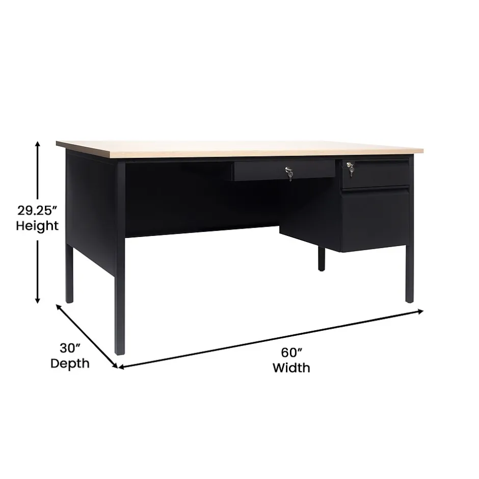 Give teachers and office workers alike a dedicated space for their tasks that is both functional and professional with this commercial grade right side single pedestal desk. Featuring a 1″ thick long-lasting laminate top, steel frame, and 3 locking drawers with ball bearing drawer slides, this multipurpose desk will stand up to the rigors of daily use. The premium materials allow this metal and wood desk to hold up to 300 lbs. static weight while the self-leveling floor glides ensure a level work surface. Assembly takes 30 minutes or less and a damp cloth is all that is needed to maintain the appearance of this must-have work space.