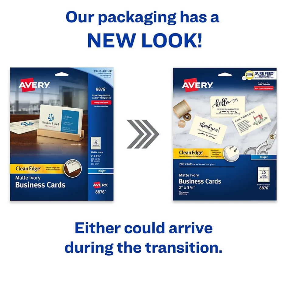 Make a lasting impression on important clients, associates and prospective customers with Avery 08876 Clean Edge Business Cards. This pack of 200 first-rate customizable business cards is made from quality cardstock with a weight of 93lbs / 254gsm, and offers an impressively substantial look and feel. If you need professional quality business cards, customer loyalty cards, appointment reminder cards or more, these 2″ x 3.5″ cards are an exceptional way to stand out from the crowd. These ivory business cards have innovative Clean Edge technology for quick and easy separation, giving you the cleanest, smoothest edges of any business card on the market. Proprietary Avery Sure Feed technology helps deliver a more reliable feed through your inkjet printer in order to minimize print misalignments and paper jams. Whether you have your own design or you’re creating one from scratch, take your brand or business to the next level with Avery Design & Print Online, which makes it easy to create and print double-sided customized cards from your own home or business. The free browser-based software has everything you need to design business thank you cards, personalized gift tags, reward cards, price tags and more. Try it out today on the Avery website.