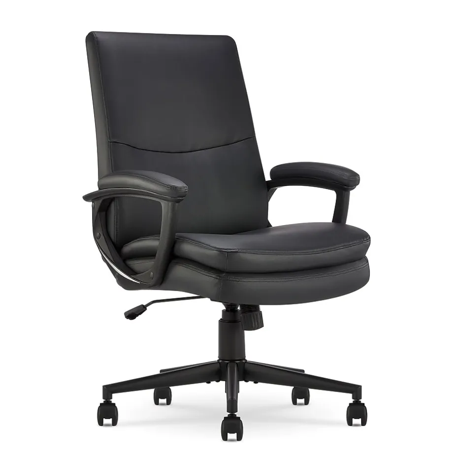 The better you sit, the better you’ll feel. Whether for work, play, or any other activity that has you sitting in our chairs, we believe comfort is everything. We know it’s a big responsibility and take it seriously, just as we do with our mattresses. With over 15 years of making chairs and innovating with designs, materials, and technology, Serta knows what it takes to give you a comfortable sit. Unwind, recharge, and conquer your workday with the Serta Comfort Modern Executive Office Chair. Featuring plush mid-back support, clean lines, luxurious channel-tufting and sculpted arms, this chair will elevate any space. A semi-plush, double-layer cushion seat with generously padded back and armrests provides ample lumbar support and will help you maintain a positive ergonomic posture while surrounding you in comfort. Thick non-recycled Serta quality foam is upholstered in a soft to touch breathable bonded leather to keep you cool during extended sitting times. Available in Black, Brown, Gray, or Cognac with matte black components. A 360º swivel metal base gives you mobility throughout the day and handles weight up to 275 lbs. Plus, the double-wheel casters ensure smooth gliding over rugs and carpet floors so you can scoot around your workspace with ease. Finding your ideal seated position is a breeze with the convenient seat-side lever. Simply adjust the height to perfectly match your stature and desk setup for a personalized fit. A perfect workday companion that adapts to your needs, the Serta Comfort Modern is made for productivity and well-being whether you’re tackling the day from a corner office or at home in the bedroom.