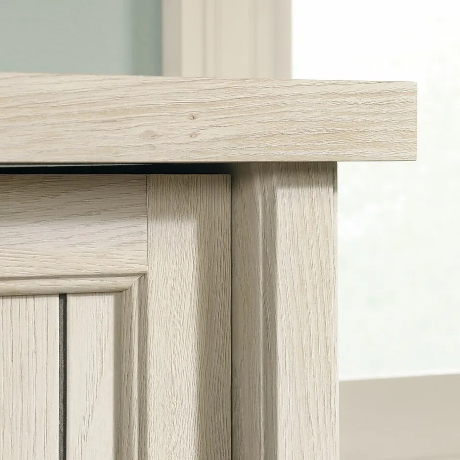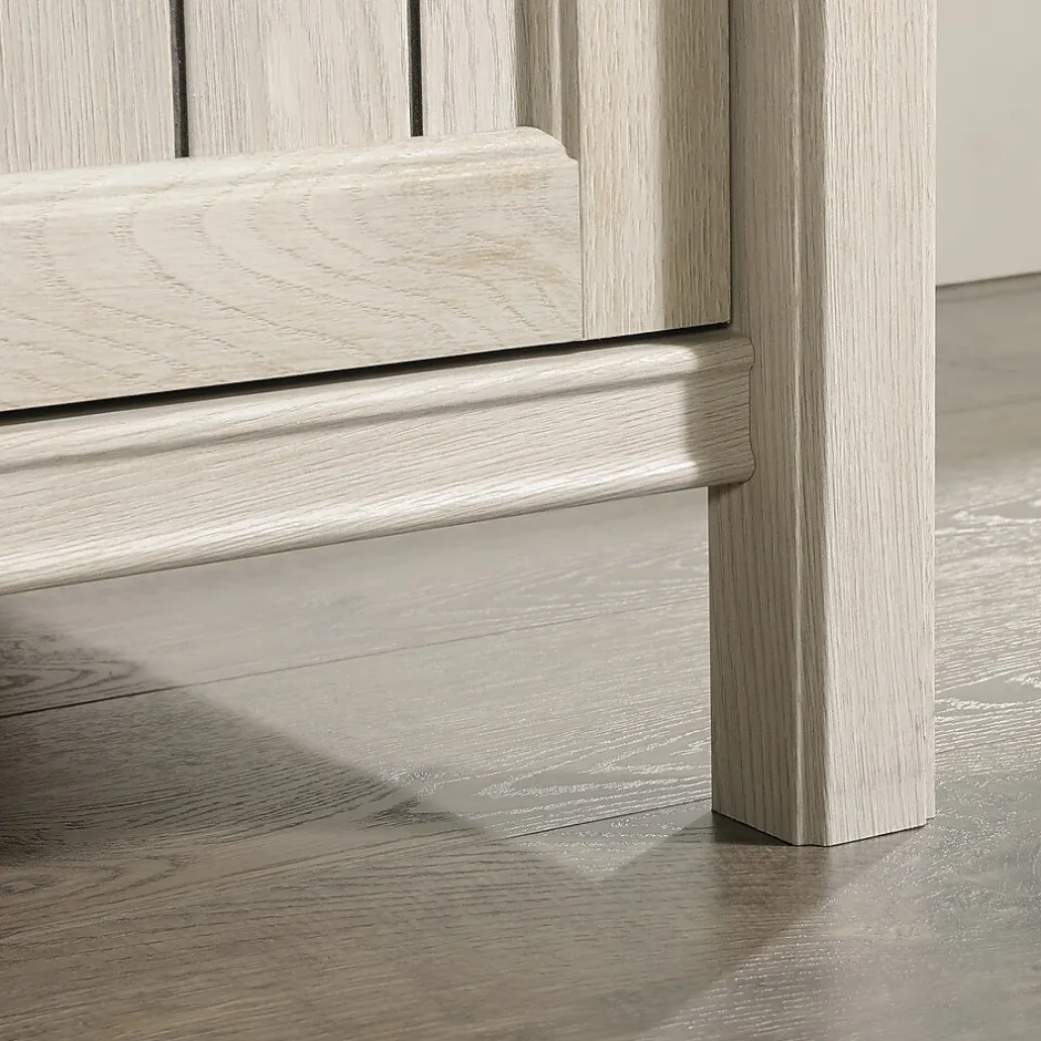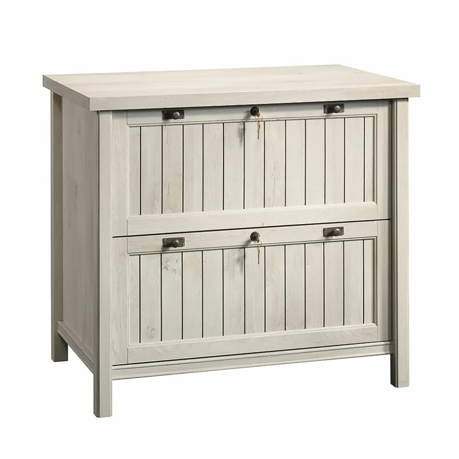 Where do you keep your important files? Stuffed in a drawer? Expand your office storage and enhance your decor with this lateral file from the Costa collection. Blending style and function together, upgrade your decor and the place you store your papers to this 2 drawer lateral file cabinet. This lateral file cabinet features full extension slides and holds letter or legal-size hanging files. A durable, 1 thick top of this wood lateral file cabinet is the perfect place for books, home decor and more. Your safety is always on our mind and this 2 drawer file cabinet includes a patented, interlocking safety mechanism that allows only one drawer open at a time. Additionally, both drawers include a lock for secure storage of your documents. Finished in Chalked Chestnut and detailed with a stylish, framed, slat-front, this cottage inspired, legal size lateral file cabinet will look stunning no matter where it stands.