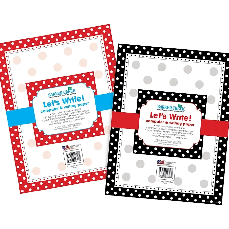 Barker Creek’s Dots Computer Paper Set is affordable and beautiful.There are 100 sheets of decorative paper – 50 each of 2 designs that measure 8 1/2″ x 11″ and are compatible with most laser and ink jet printers.Use them to add a memorable touch to letters, design custom awards and certificates, add an extra “wow” to presentations and reports, create gorgeous invitations, make stunning bulletin boards, and so much more!The possibilities are limited only by your imagination!Coordinating product available: Search Barker Creek Dots.