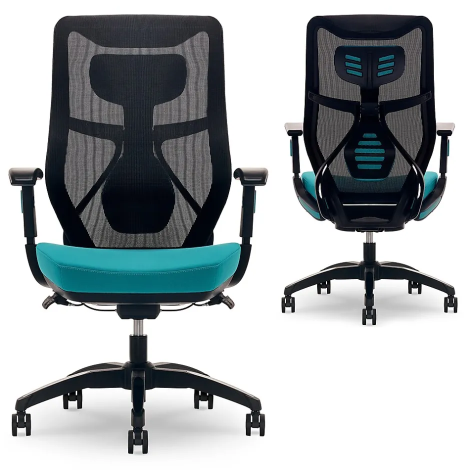 - Made with suspension mesh back in black and fabric-upholstered seat in teal