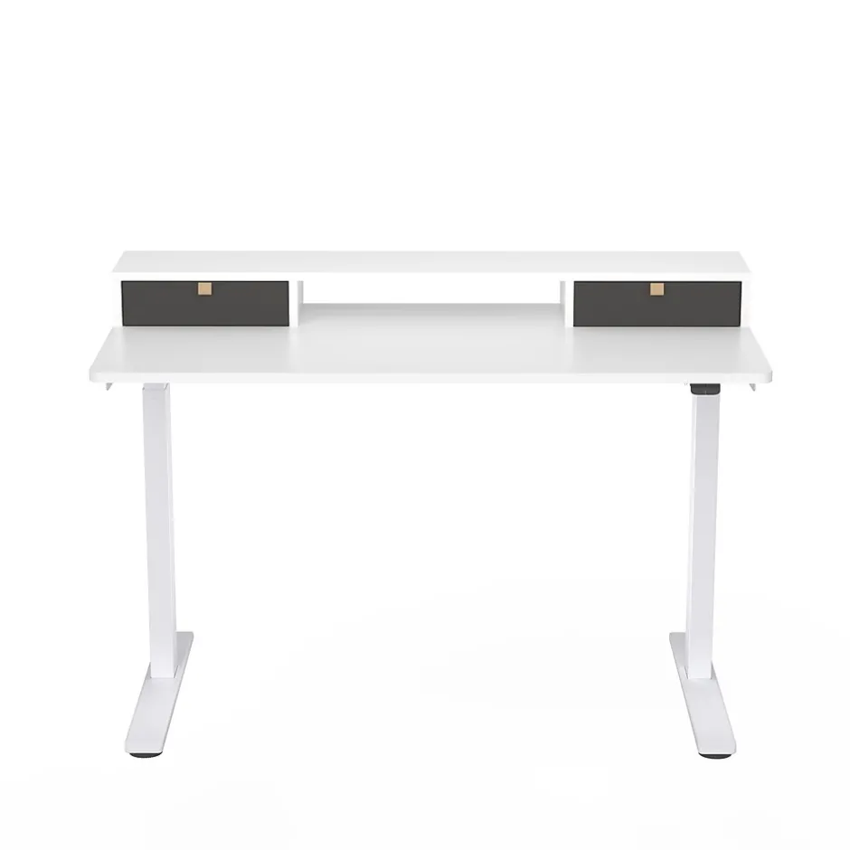 New to the series, the EC9WDO04W includes a shelf with 2 fabric storage drawers. The shelf system is not fixed to the table top, but has no-slip rubber feet which makes setup easy. The desk in this bundle is the EC9W which is a favorite for work from home or remote worker programs. It arrives partially assembled from the factory so it just requires a few steps to complete.