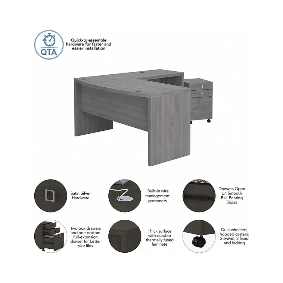 - Bundle includes: 60W Bow Front Desk, 36W Return, 3 Drawer Mobile File Cabinet