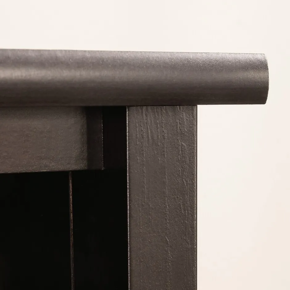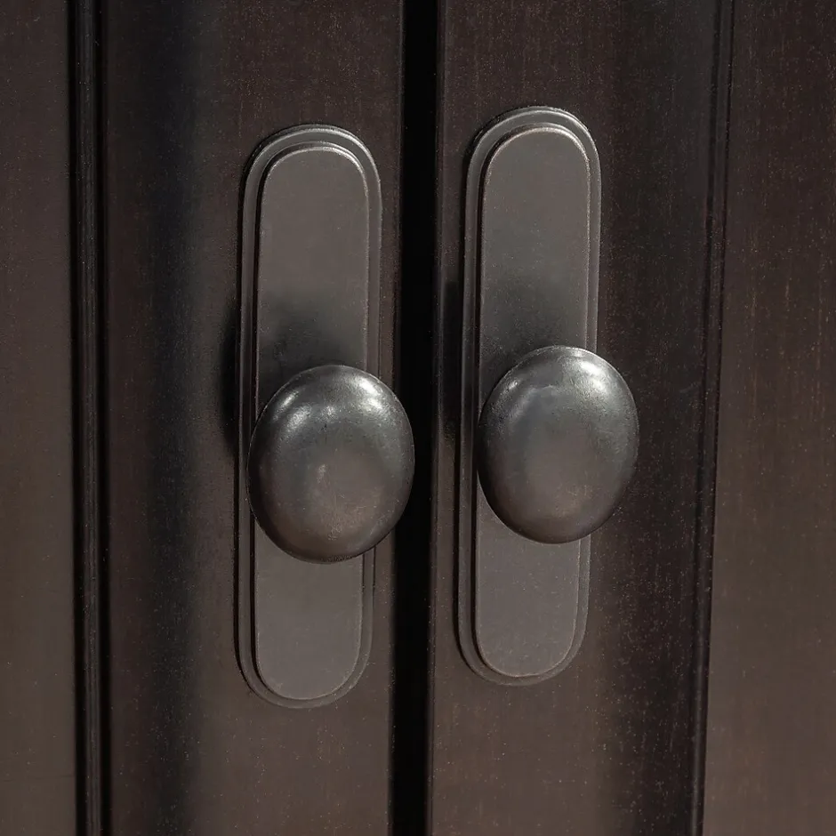 A tall, dark, and mysterious figure enters your home, and suddenly your life changes forever. Welcome the two-door storage cabinet, finished in the ebony brushed gloss of Estate Black. With subtle, golden, woodgrain highlights, this double door storage cabinet from the Edge Water collection will have the look of a priceless antique, but the function and value of a modern cabinet. Behind the two doors of this storage cabinet, your linens, tablecloths, seasonal decor, or movie collection can remain a secret. This storage cabinet with doors has four adjustable shelves creating versatile storage solutions for innovative organization. In addition to the mysterious, spacious storage inside, this storage cabinet with open shelf above has even more room for placing baskets and bins, or displaying photos, antiques, artwork and more. A remedy for modern household challenges can be found with this transitional style storage cabinet, featuring a timeless and elegant look with modern storage solutions.