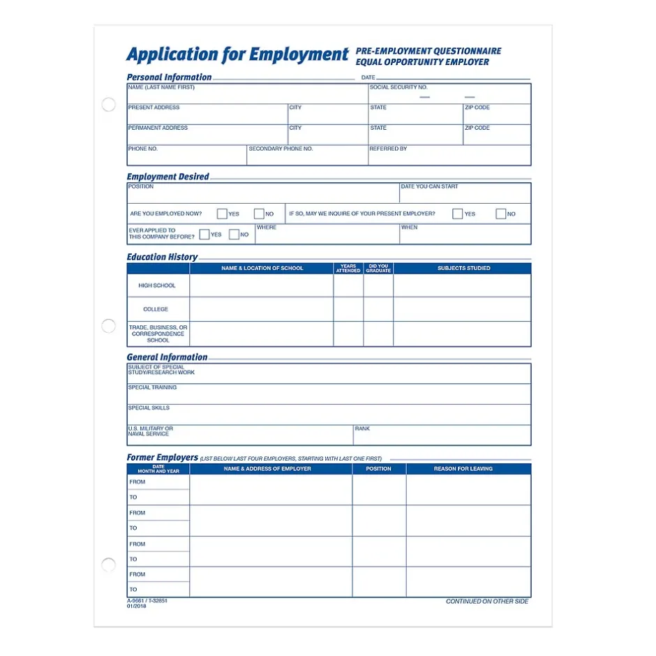 Make applying for employment simple by using these letter-size employment application forms. Each one is printed in English for convenience, while the three-hole-punched edge lets you conveniently insert them into any standard three-ring binder. These Adams employment application forms comply with all legal requirements and have 50 sheets per pad, so stocking up is easy.