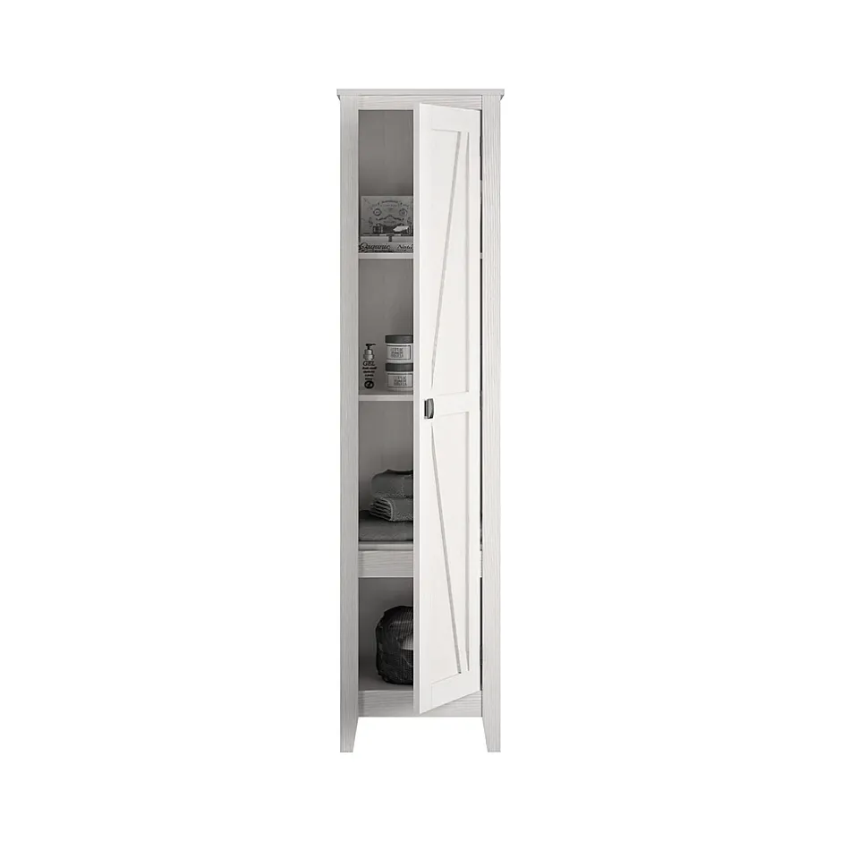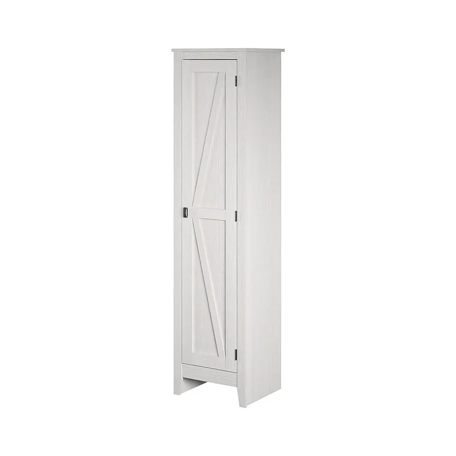 The System Build Farmington 18″ wide storage cabinet is a stylish way to stay on top of your organization. The rustic barn style design and sleek tapered feet give the look of an old weathered cabinet, but the sturdy laminated particleboard and MDF make this cabinet the perfect piece to house your home office supplies, extra linens, seasonal clothing, nonperishable food, and more. Open up the door to four spacious shelves (two adjustable) to fit items of differing sizes. The weathered finish will bring a nice rustic appeal to your space. The System Build Farmington cabinet is recommended to be assembled and moved by two adults. A wall anchor kit is provided for extra safety and security.