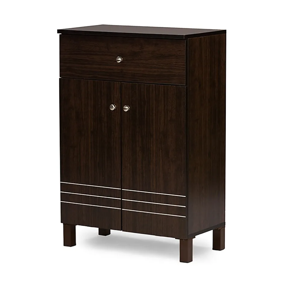 Compact and well-designed, the Baxton Studio Felda 35″ High Wood Shoe Cabinet with Three Shelves is a stylish addition to the home. Featuring three shelves and one drawer, it has sufficient space to accommodate your footwear and other related accessories. Constructed from engineered wood, the cabinet showcases a dark finish which complements a variety of color and décor schemes. The white-striped pattern on the bottom adds a decorative touch. The Felda cabinet is made in Malaysia and requires assembly.